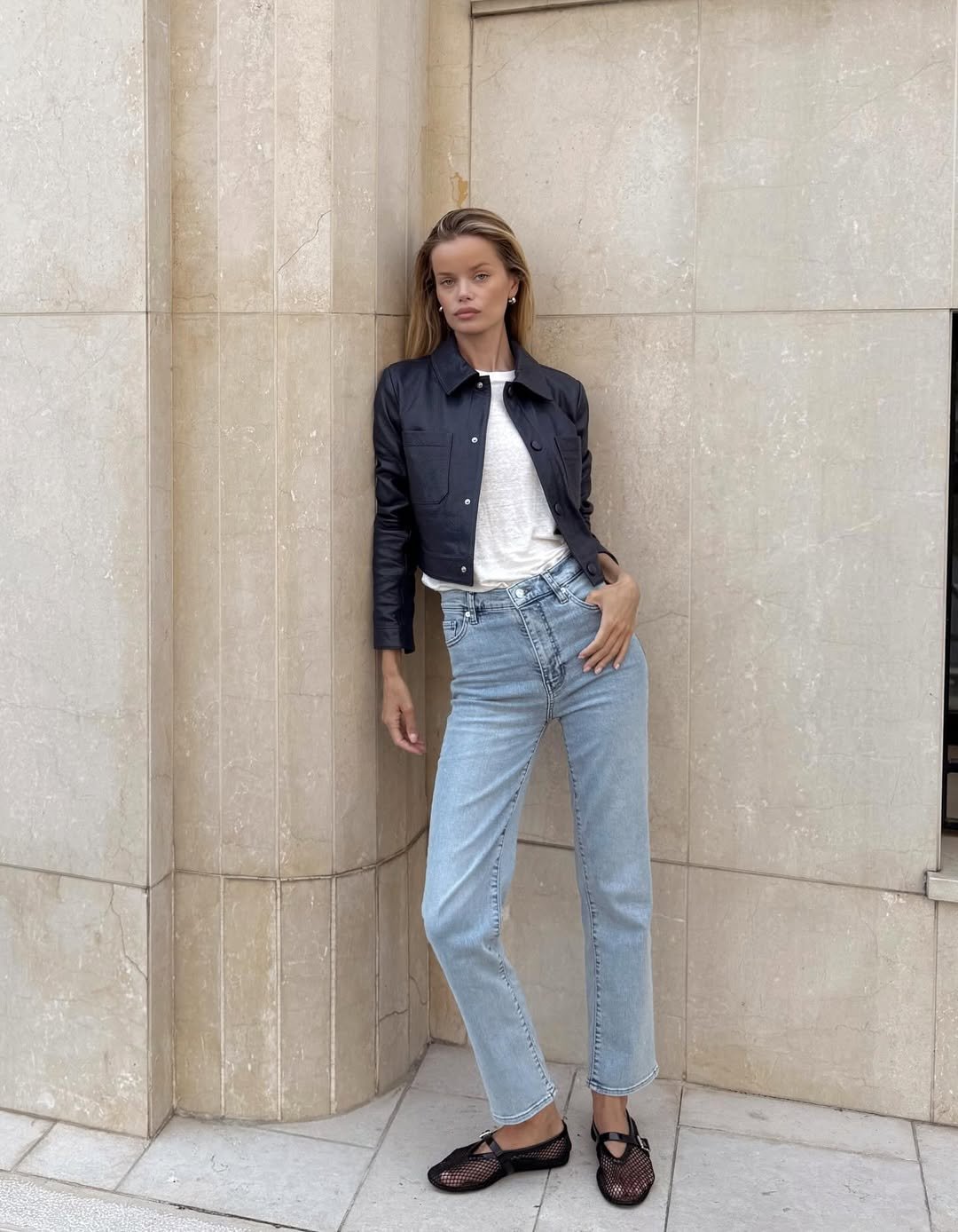 Light-wash straight leg jeans keep the look relaxed, and mesh flats add a touch of modern personality. It’s a cool, contemporary outfit ideal for exploring stylish urban neighborhoods.