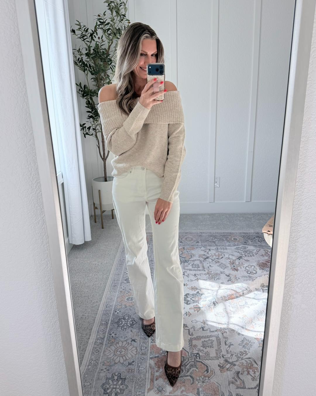 Achieve instant polish with a palette of soft, creamy neutrals. This ensemble features an off-shoulder knit sweater paired with crisp straight leg jeans, striking a perfect balance between relaxed ease and refined style. The gentle beige tones maintain an elevated feel, ensuring the look is cozy without appearing sloppy.