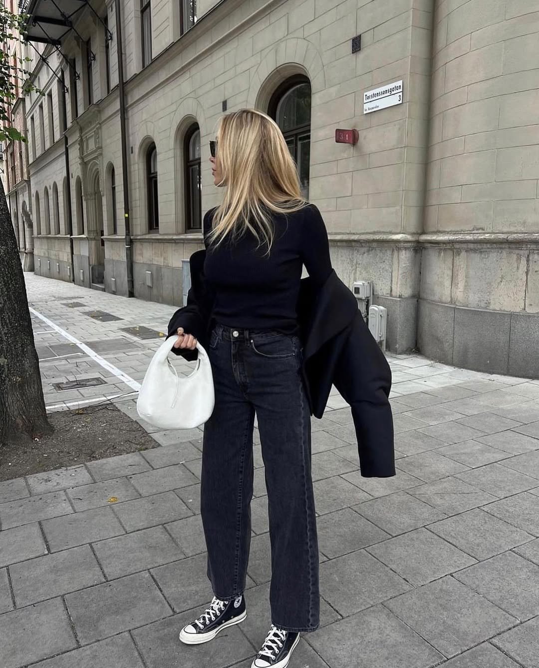 Converse sneakers bring a grounded, casual element to the outfit. This look is perfect for navigating city streets with a coffee in hand, appearing put-together without conscious effort.