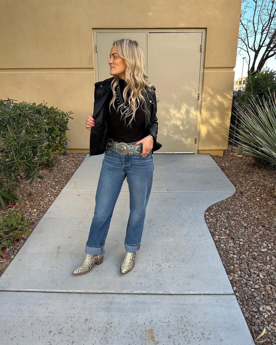 Injecting a bit of Western-inspired style into straight leg jeans results in a confident and distinctive look. A sleek black top and leather jacket form a sophisticated base, while a striking turquoise belt serves as a captivating focal point that enhances the denim.