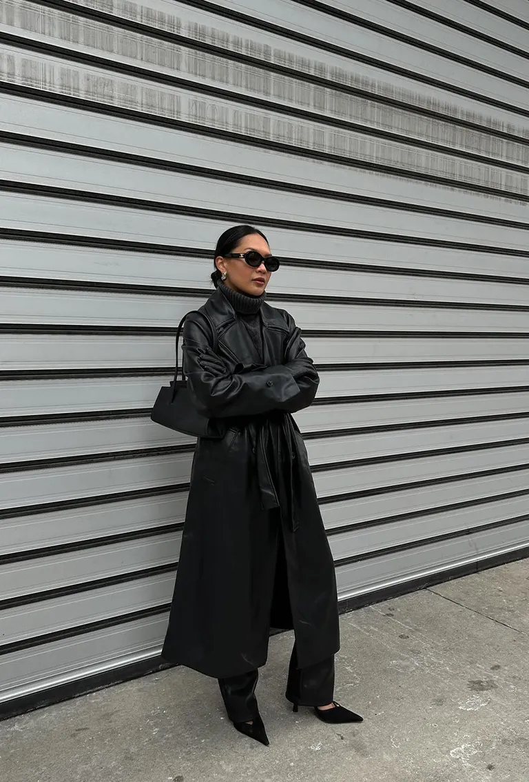 An all-black outfit done right is unbeatable—and this one nails it. The leather coat, sleek tailoring, and sharp accessories give serious boss energy.