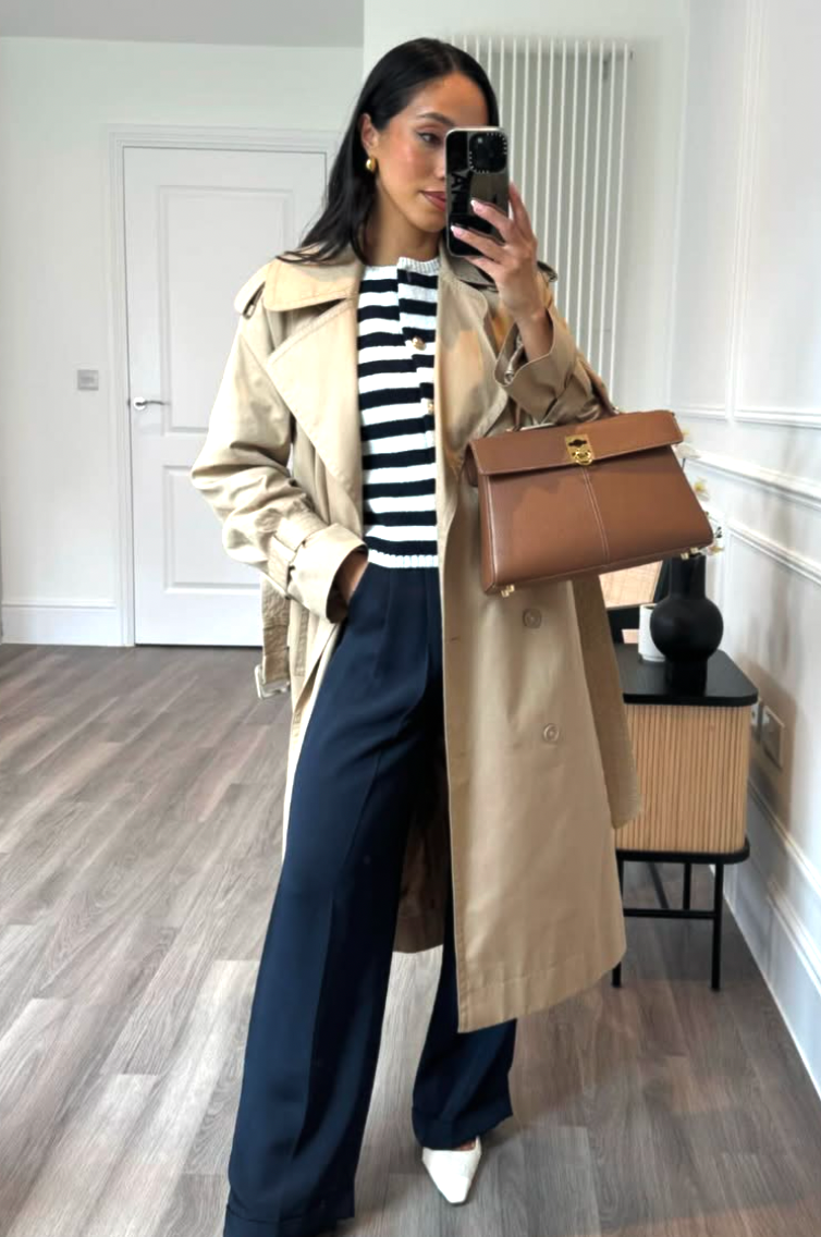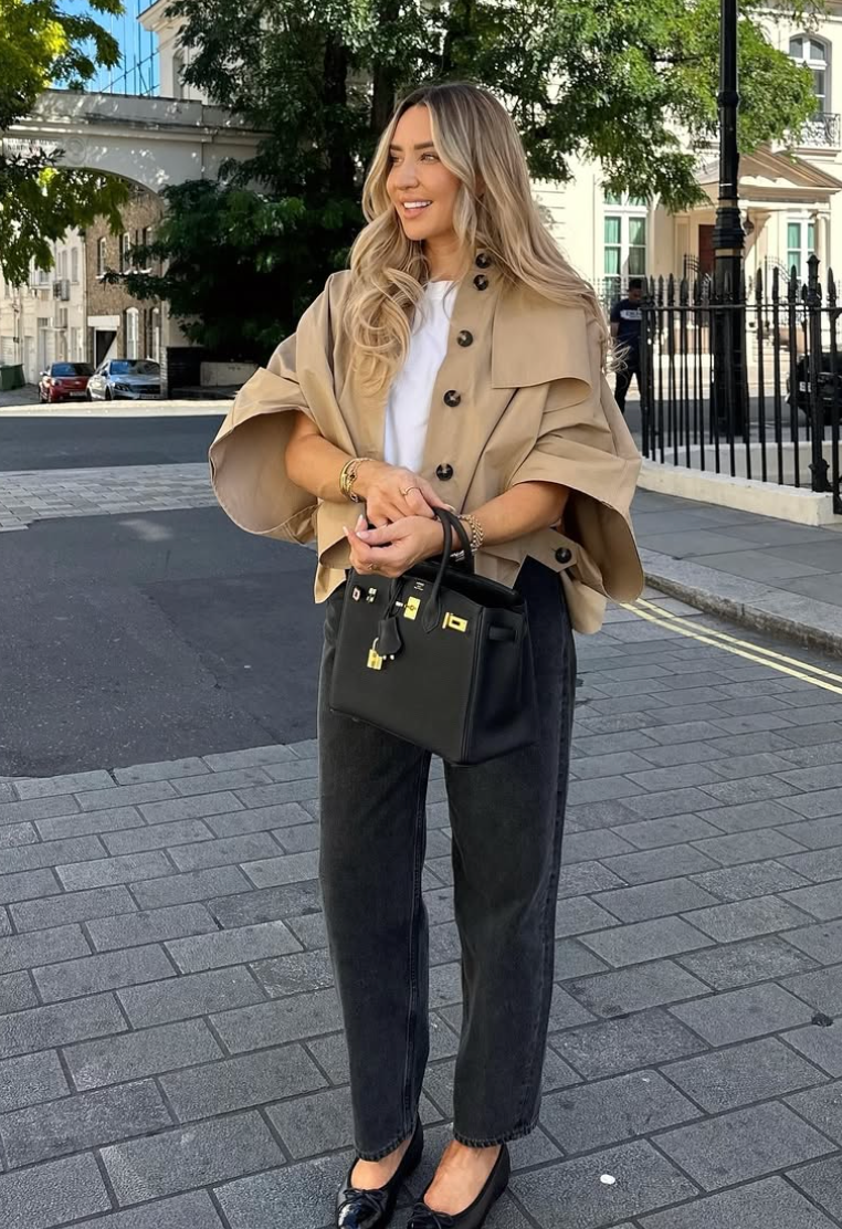 There’s something quietly confident about this look—the kind that doesn’t rush into the room, but still owns it. The cropped trench layered over a simple white tee feels relaxed yet intentional, especially paired with dark denim and classic flats. It’s polished without feeling stiff, which is exactly what modern workwear should be.