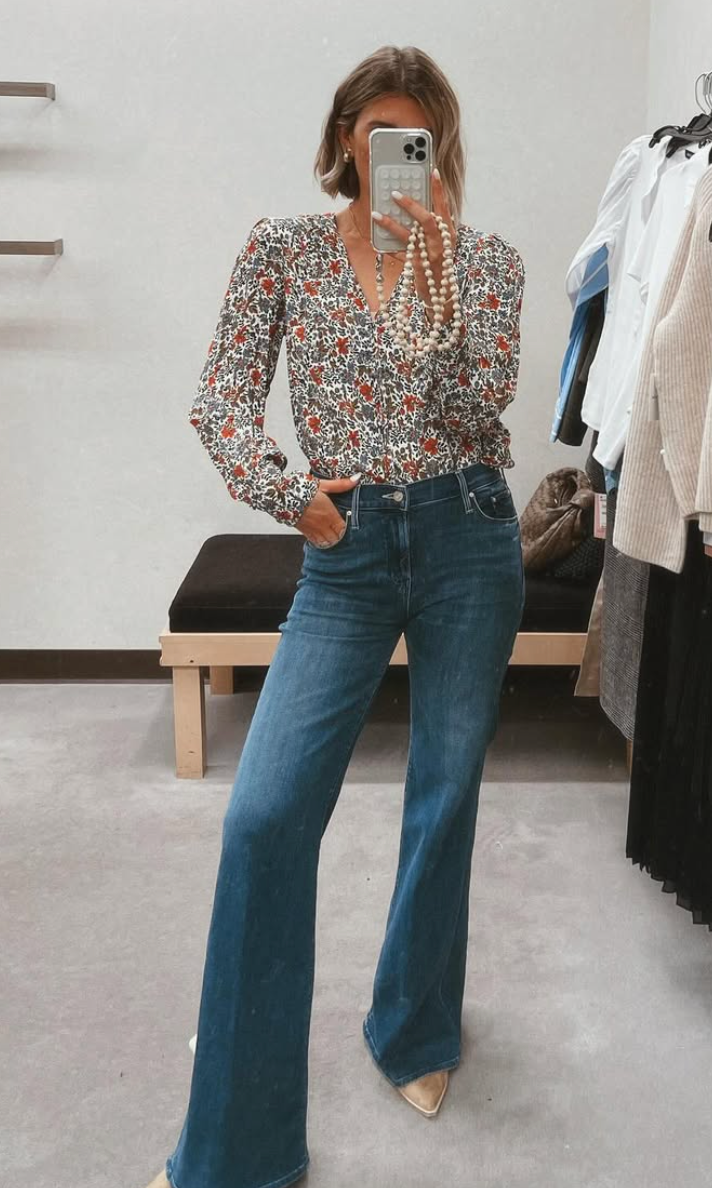 Florals at the office? Absolutely—when done like this. The structured blouse paired with classic denim strikes that sweet spot between feminine and functional.
