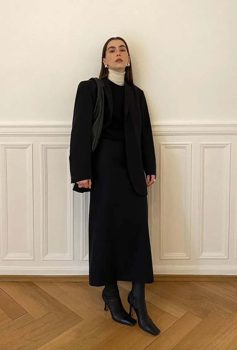 All-black, but far from boring. The long blazer layered over a sleek dress creates strong lines and an even stronger presence. It feels architectural, clean, and very editorial—ideal for creative or fashion-forward workplaces.