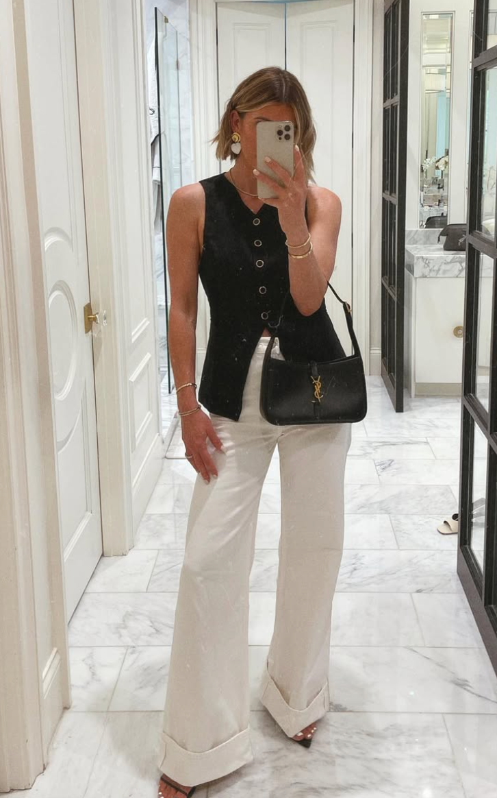 This black-and-white combo is timeless for a reason. The sleeveless top, tailored trousers, and sleek accessories feel sharp, modern, and very intentional.