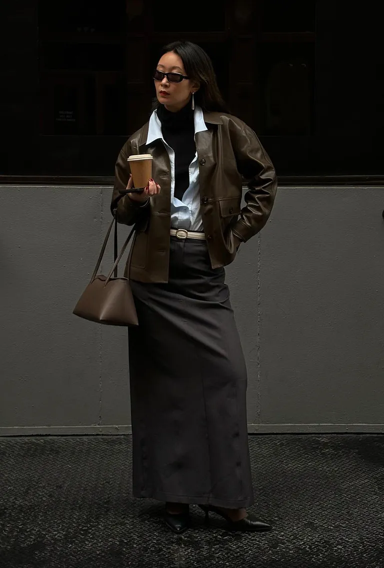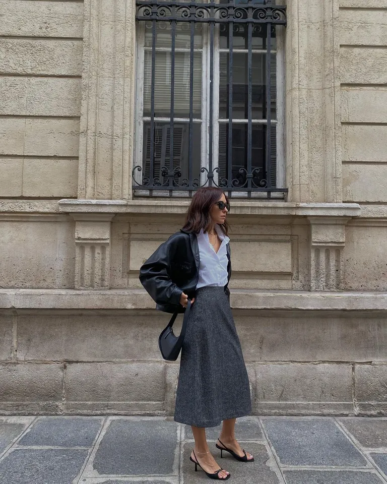 This look is all about quiet confidence. The structured grey blazer, cinched just right, paired with a fluid black skirt feels polished without trying too hard. It’s giving “running late but still owning the room” energy—and honestly, that’s a workwear skill.
