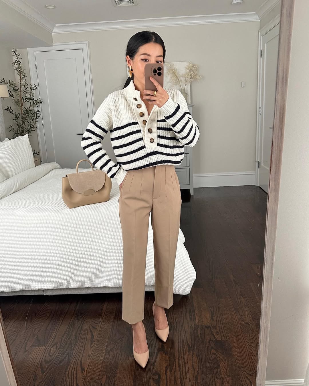 This look is pure refinement. The striped knit tucked into tailored trousers feels timeless, almost like something you’d spot on a quiet Paris street before a morning meeting. Neutral heels and a clean silhouette keep it grounded and professional.