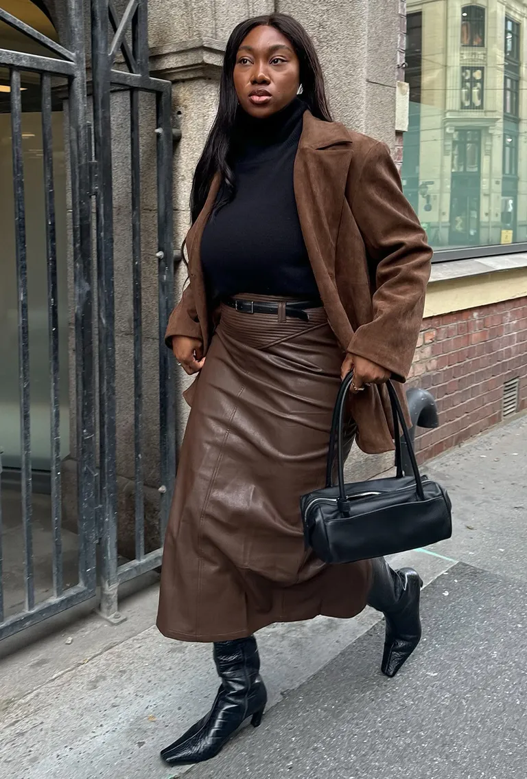 This look is all about depth. The rich brown tones layered with black feel luxe and powerful, especially paired with a leather skirt and boots. It’s bold without being flashy—confident without trying too hard.