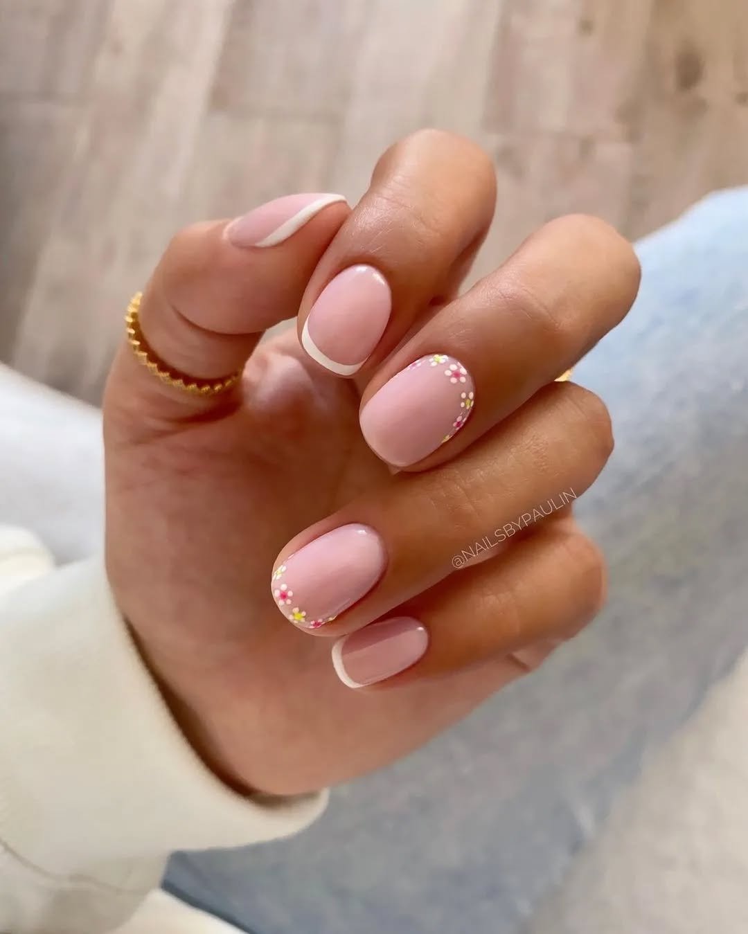 For those who appreciate basic nails with a charming twist, this design is ideal. Soft pink nails are adorned with thin white French tips, further enhanced by tiny floral details placed at the corners. The delicate flowers give the design a light, springtime feel, creating a look that is both sweet and captivating.