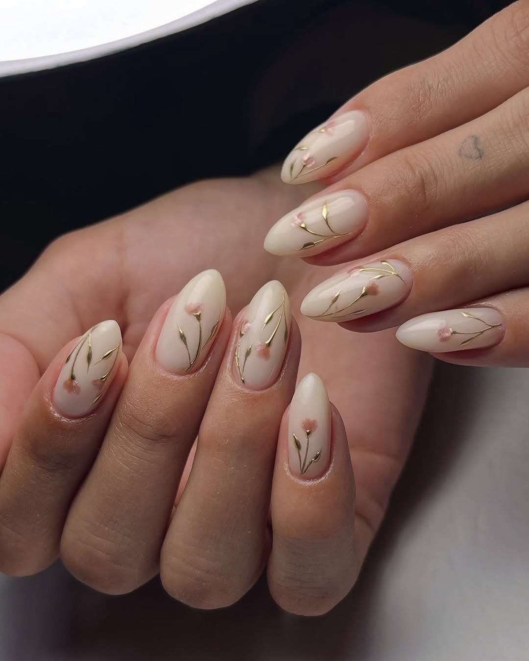 This elegant set features a soft milky nude base adorned with fine gold stems and tiny blush flowers that artfully trail across the nails. The delicate details create a romantic, almost heirloom-quality feel, making it a beautiful choice for weddings and special occasions.