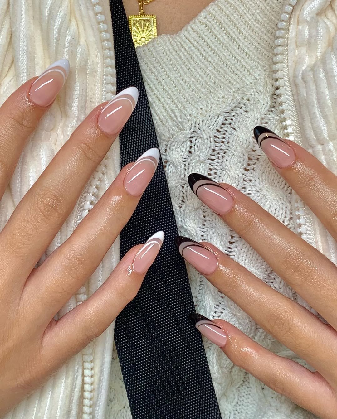 This manicure presents a crisp French style with a sophisticated twist. Some nails feature classic white tips, while others are adorned with deep black tips, creating a subtle yet impactful contrast. The result is a polished and fashion-forward look that feels effortlessly put-together.