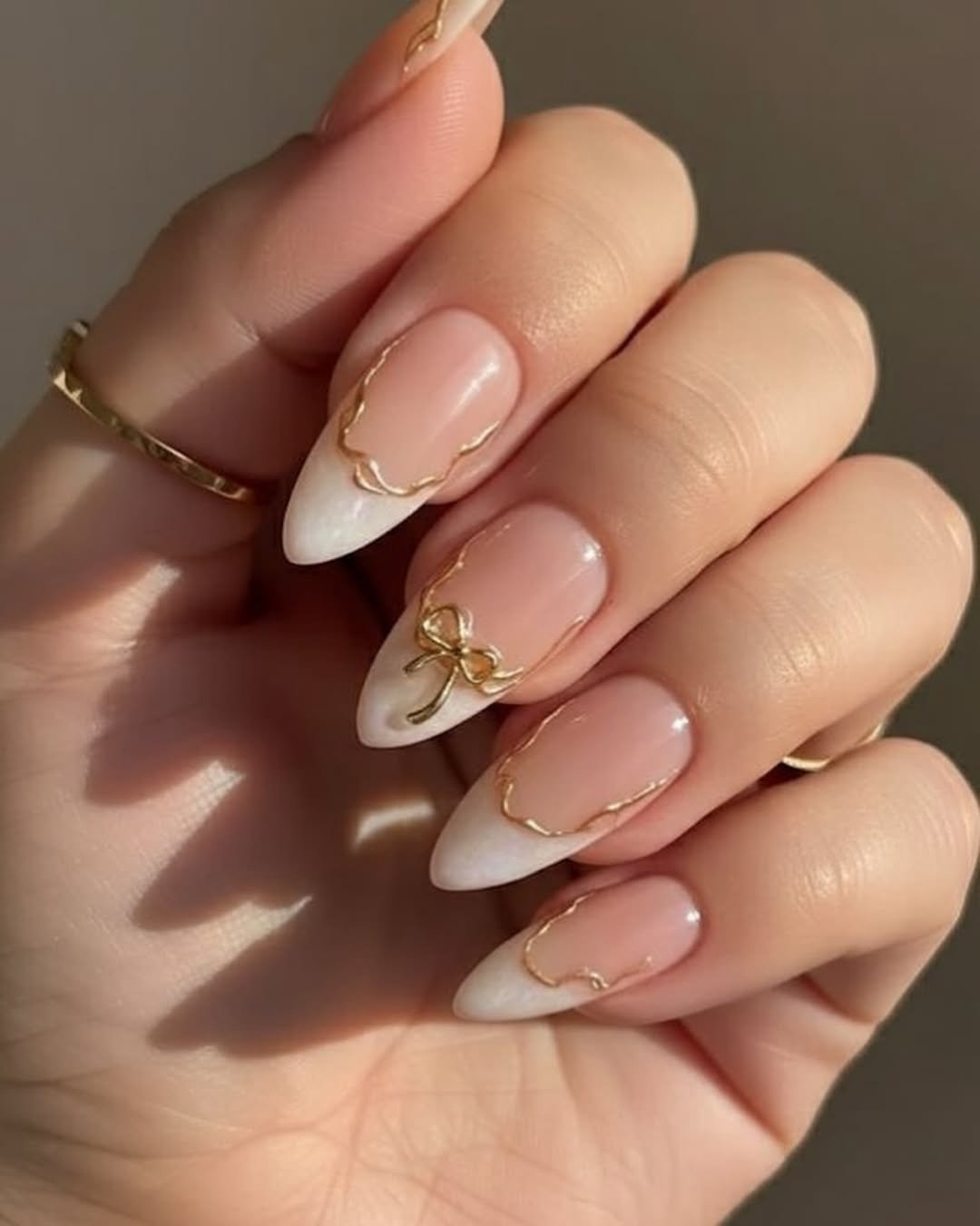 This design elevates the classic French manicure with luxurious touches. A soft pink base transitions into subtle white tips, framed by refined gold outlines. The addition of a small gold bow detail adds a charming and polished finishing touch, turning a simple manicure into something quite magical.