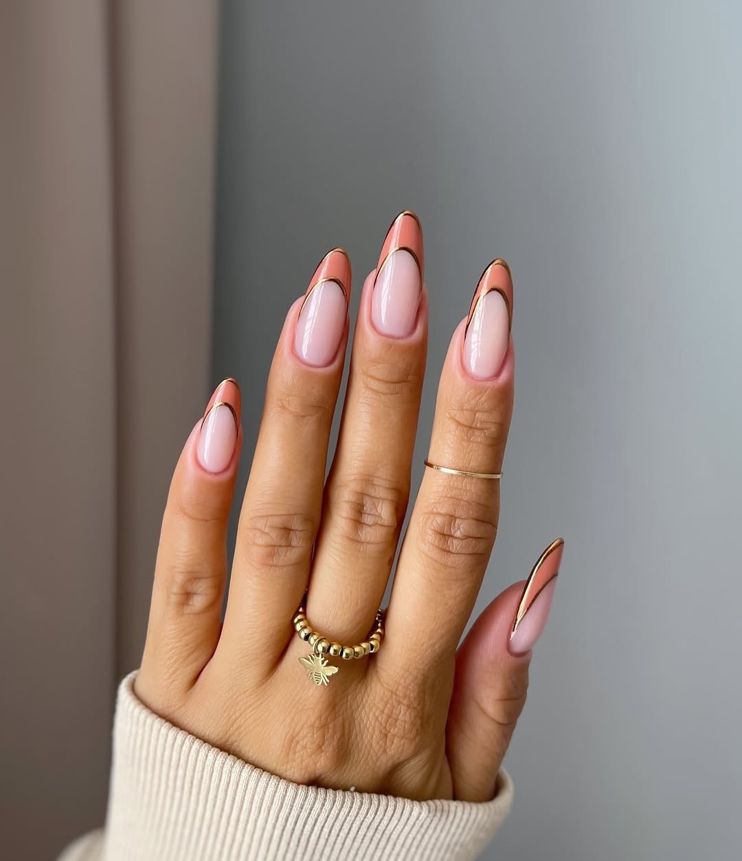 These nails offer a quietly striking aesthetic. The soft, natural nude base is enhanced by angled peach French tips, all outlined with a thin gold line that introduces a touch of subtle shine. This design is minimal yet elevated, akin to a classic manicure adorned with delicate jewelry.