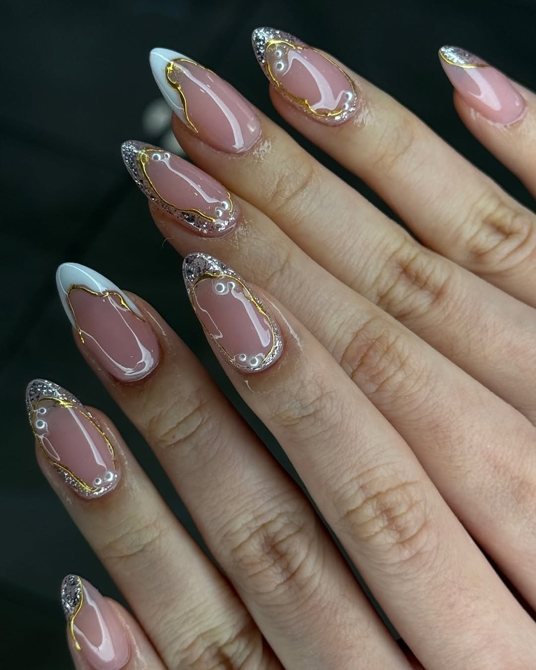 This set transforms nails into wearable art with delicate gold lines framing a nude base and sparkling glitter tips. The design feels luxurious yet balanced, resembling intricate golden frames that elevate a simple manicure into a high-end salon creation.