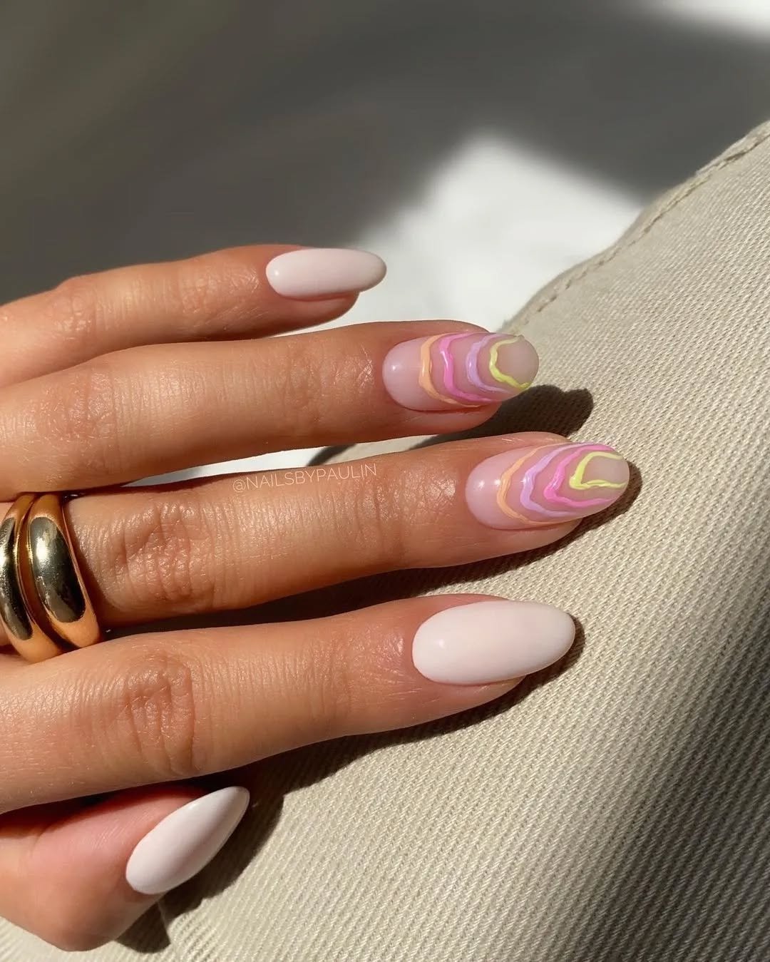 This set maintains a predominantly neutral base while incorporating playful accents. Creamy nude nails serve as a serene foundation, contrasted by accent nails featuring soft pastel swirls in shades of pink, yellow, and peach. The design feels artistic and engaging without being overwhelming, offering a subtle artistic flourish within a minimalist framework.
