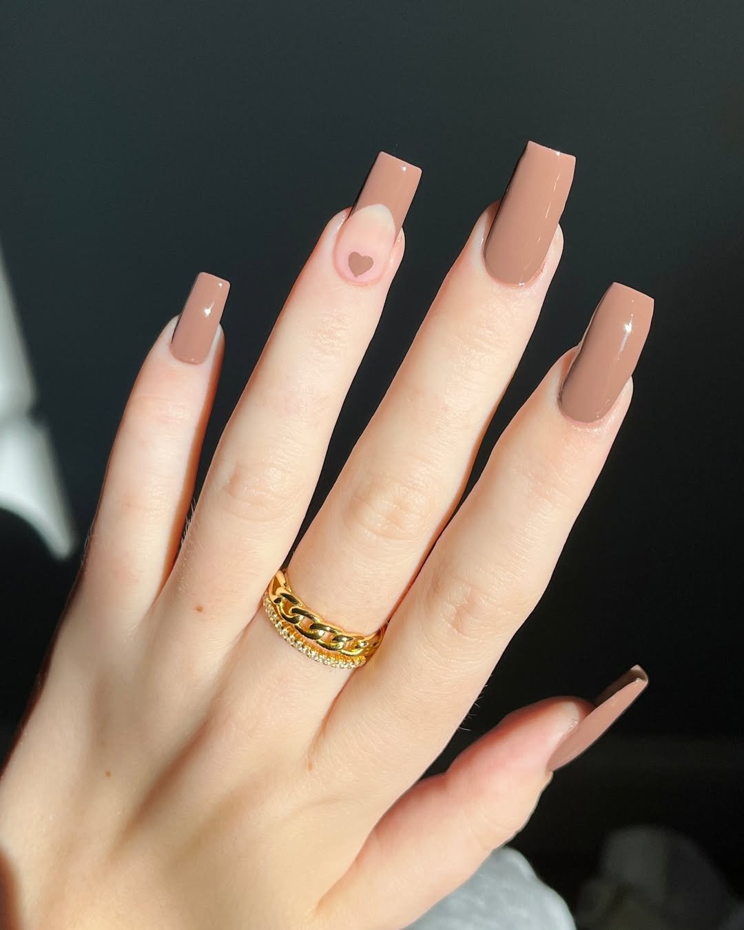 These glossy mocha nails exude a warm, polished, and stylish vibe. The rich neutral color dominates most nails, with one accent nail featuring a soft heart design that adds a touch of sweetness. It’s a cozy, elegant, and subtly romantic manicure, perfect for pairing with subtle jewelry.