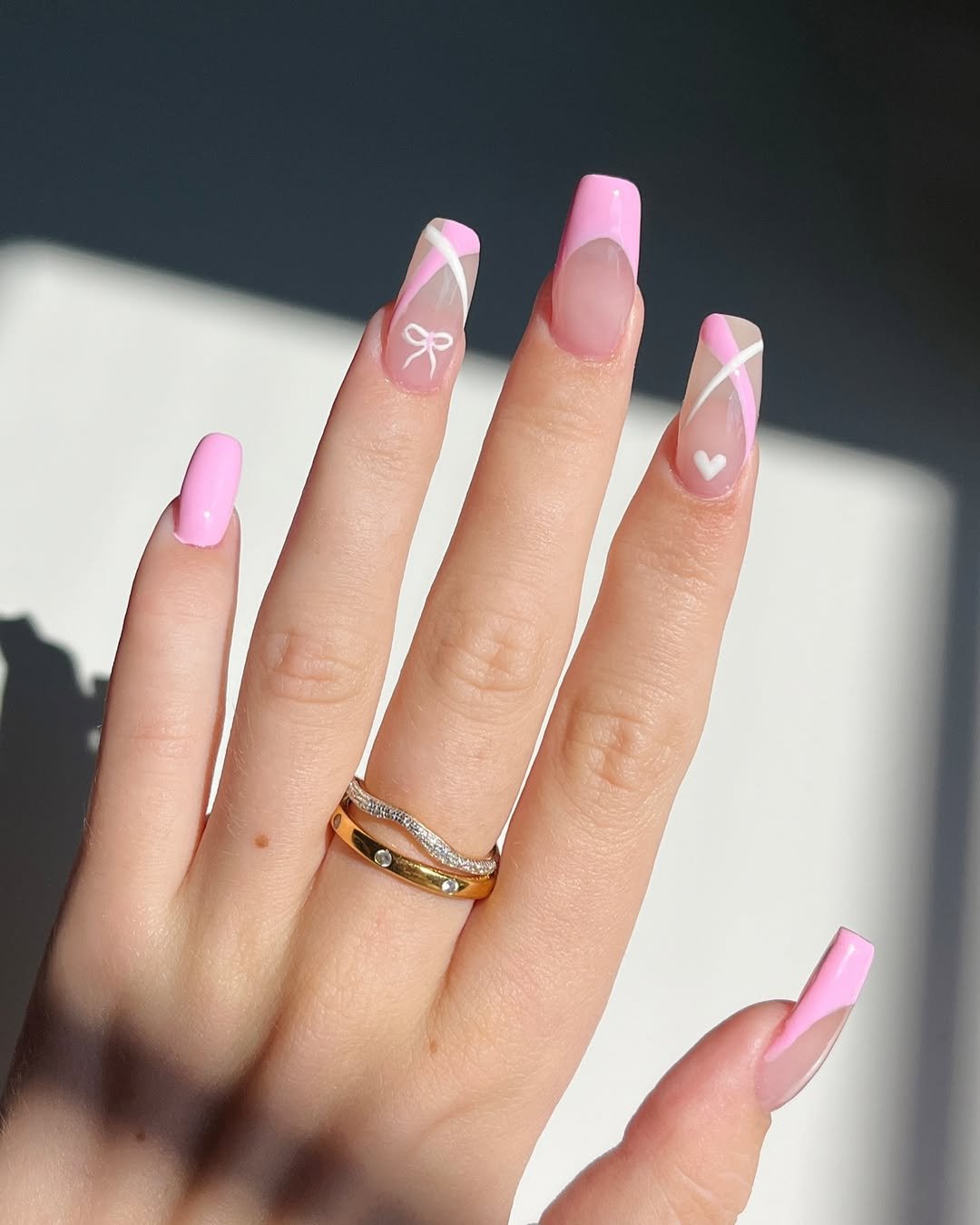This playful manicure combines soft pink polish with abstract sections of nude and white lines, highlighted by a tiny bow detail that captures attention. The design feels sweet, youthful, and charming, adding a delightful focal point to the hands.