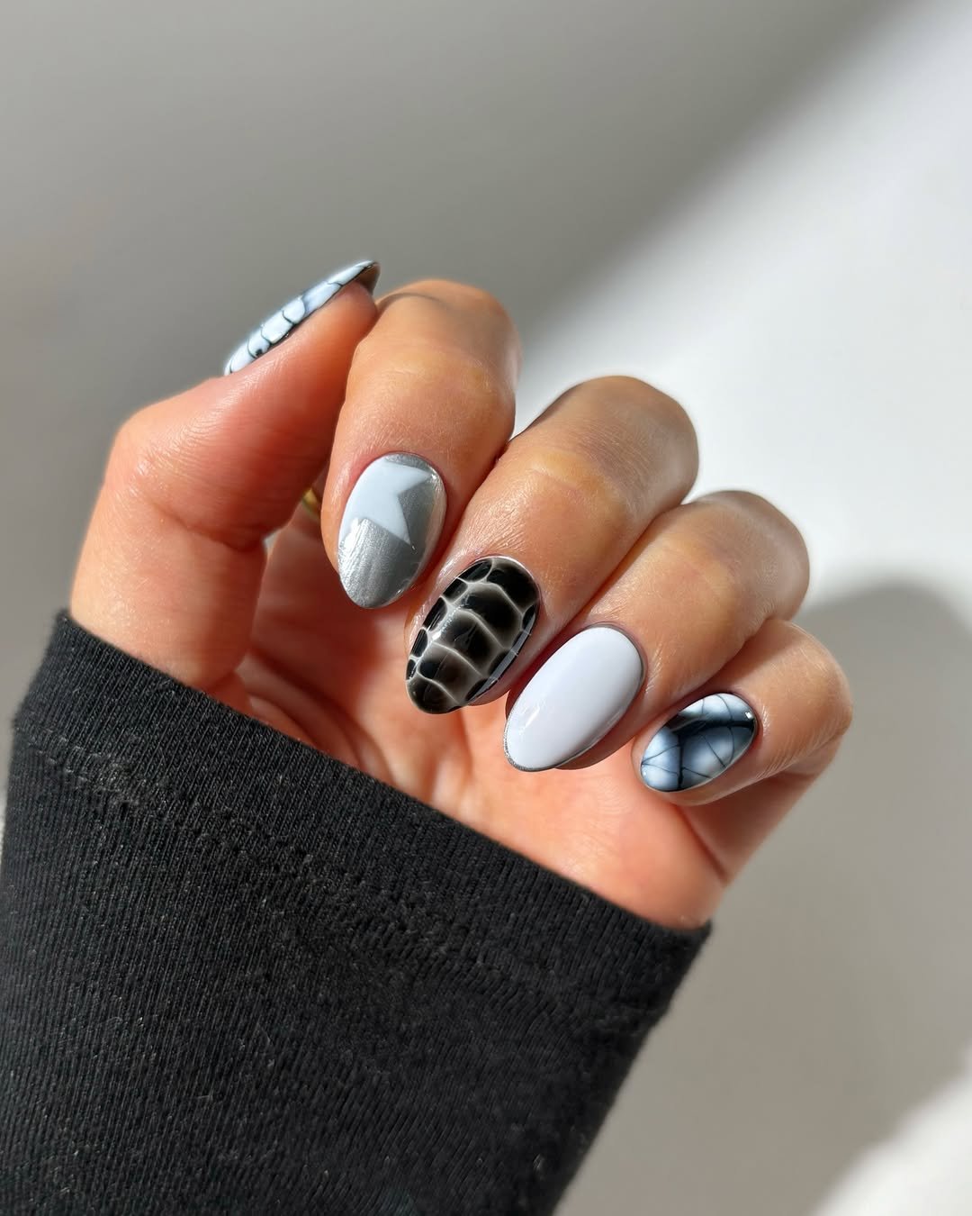 This design offers a bold, modern aesthetic through a mix of glossy gray, silver metallic, and deep black marble textures. The stone-like appearance is sophisticated and elevated, with each nail featuring a distinct pattern that flows cohesively into an edgy yet controlled look.
