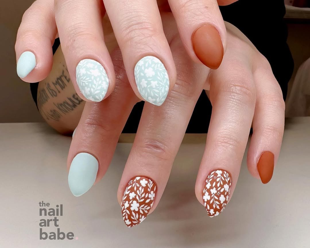 This manicure evokes a serene garden walk with its palette of muted mint and warm terracotta. Delicate white floral patterns add a handcrafted charm, reminiscent of fine fabric. The balance between solid minimal nails and those with subtle botanical details creates a thoughtful, artistic, and earthy aesthetic.