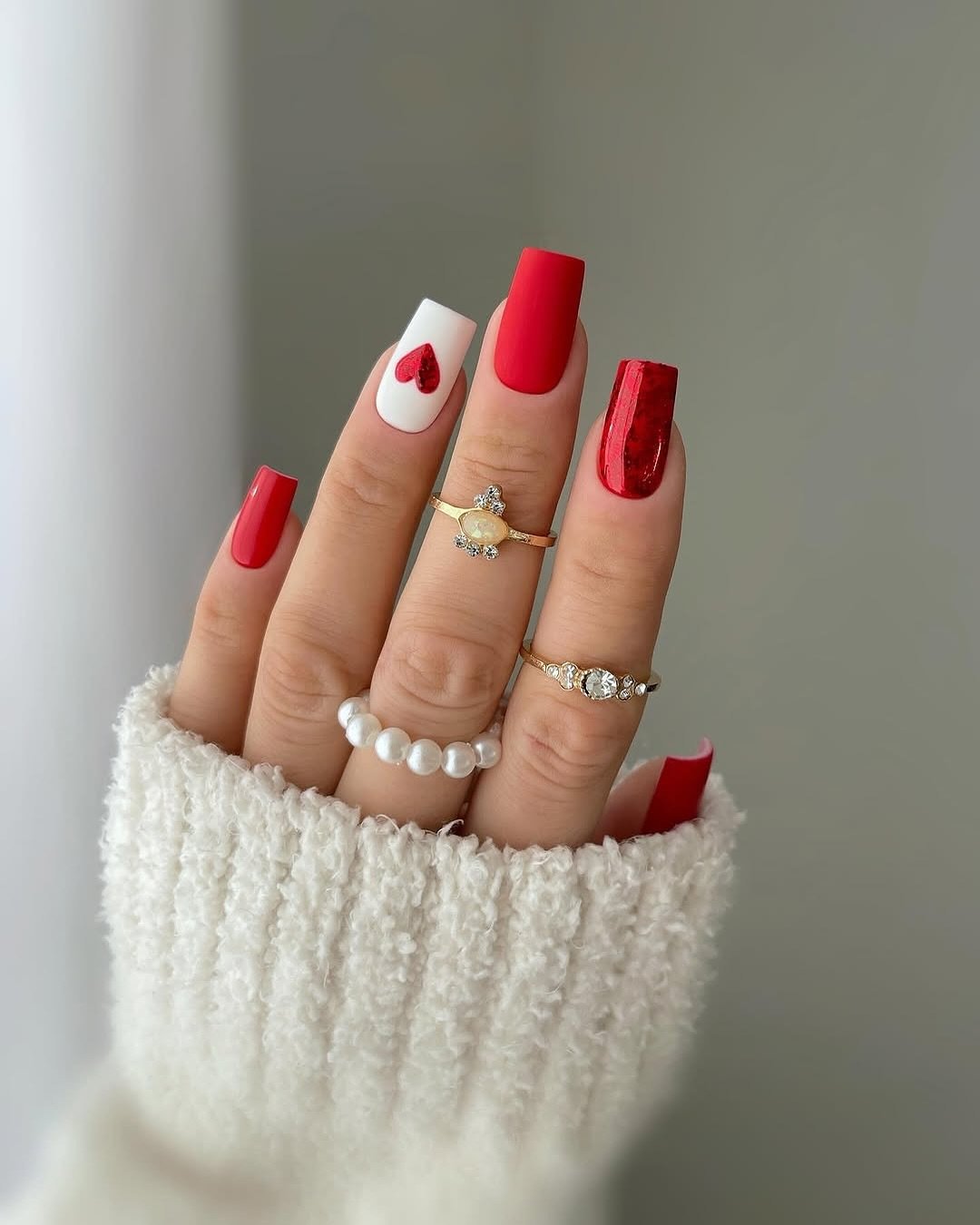 This manicure embraces classic romance with a rich, glossy red hue across most nails. A single white accent nail features a simple red heart, immediately drawing the eye. The design is cute, bold, and memorable, perfect for occasions calling for a touch of charm.