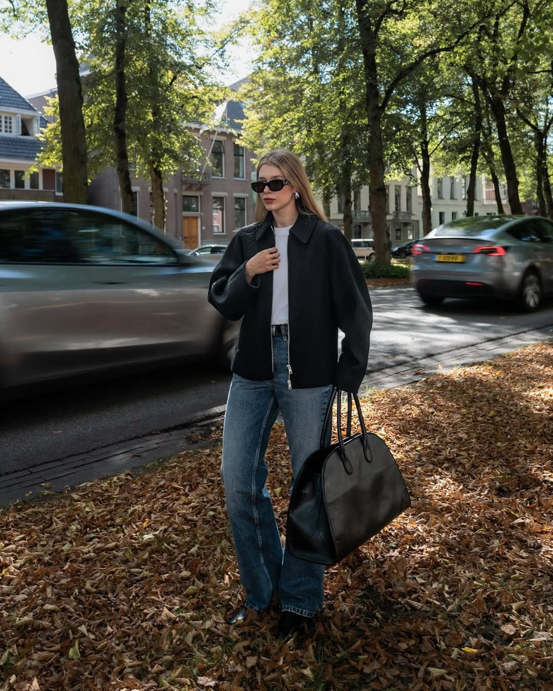 A cropped black jacket, straight-leg denim, and an oversized tote bag are ideal for crisp autumn afternoons. The dark layers against the blue jeans provide contrast without appearing heavy.