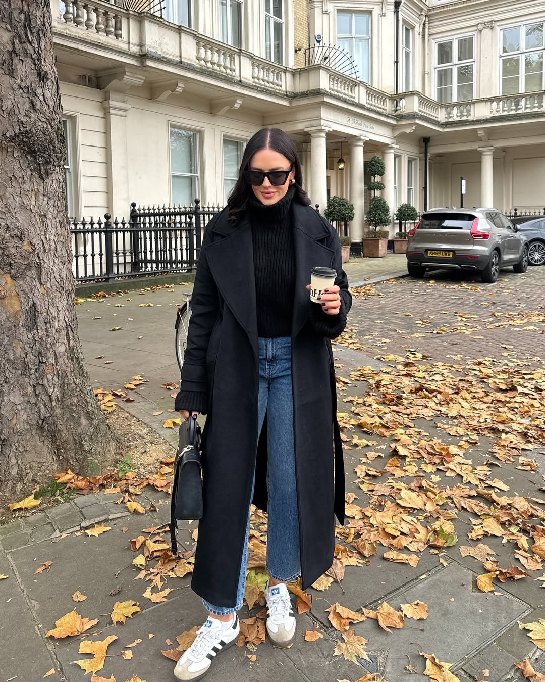 A long black coat layered over a chunky black knit with cropped denim and sporty sneakers defines sleek fall layering. The tonal black top half makes the blue denim stand out even more.