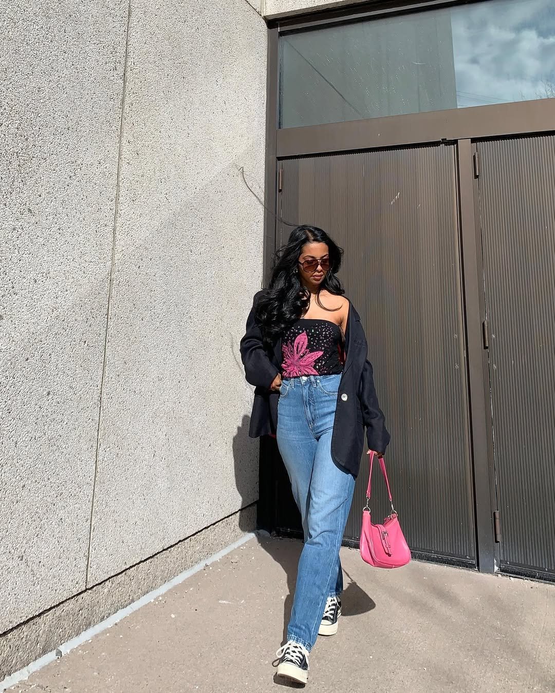 High-rise blue jeans and a strapless statement top create an immediate visual impact, enhanced further by an oversized black blazer. The addition of a pink bag introduces a playful and striking element that commands attention.