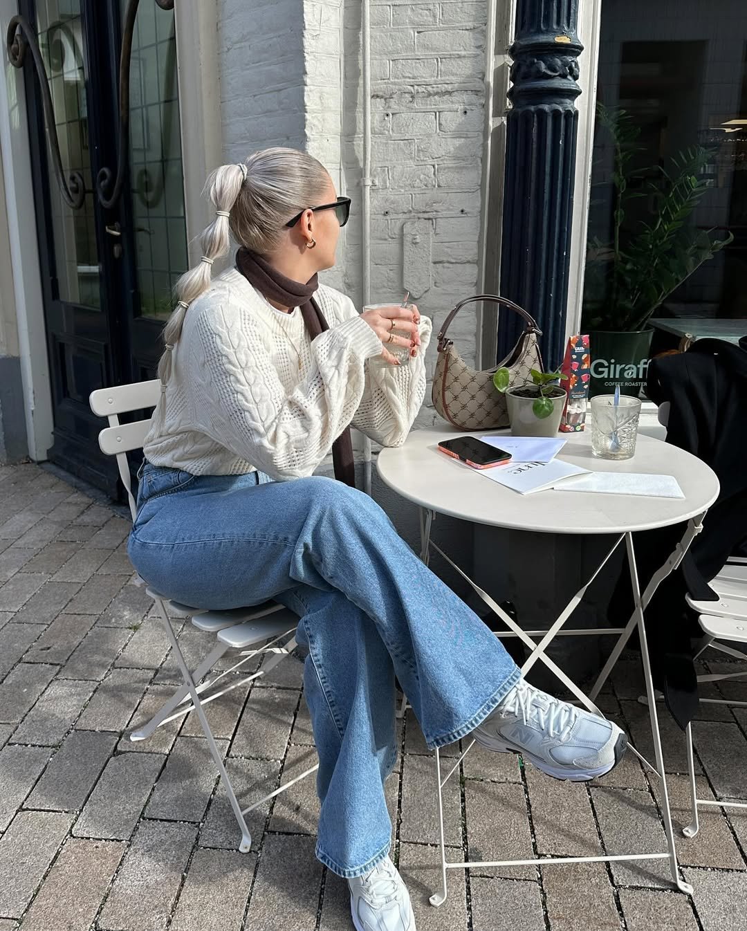 An oversized cream cable knit sweater paired with relaxed flared jeans forms the blueprint for elevated off-duty style. Adding chunky sneakers and a sleek ponytail enhances the aesthetic, giving it an editorial flair for a coffee run.