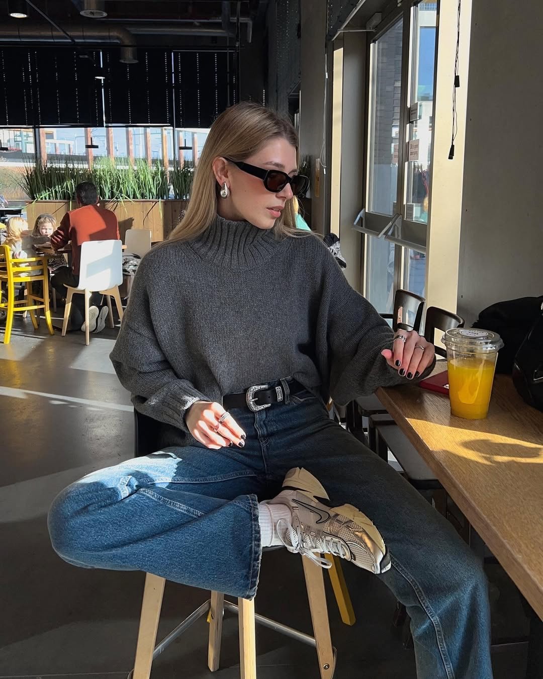 An oversized charcoal knit sweater tucked into straight-leg jeans embodies that effortlessly cool aesthetic that remains perpetually popular. Adding a statement belt, sleek sunglasses, and retro sneakers elevates this ensemble, giving a coffee date an editorial edge.