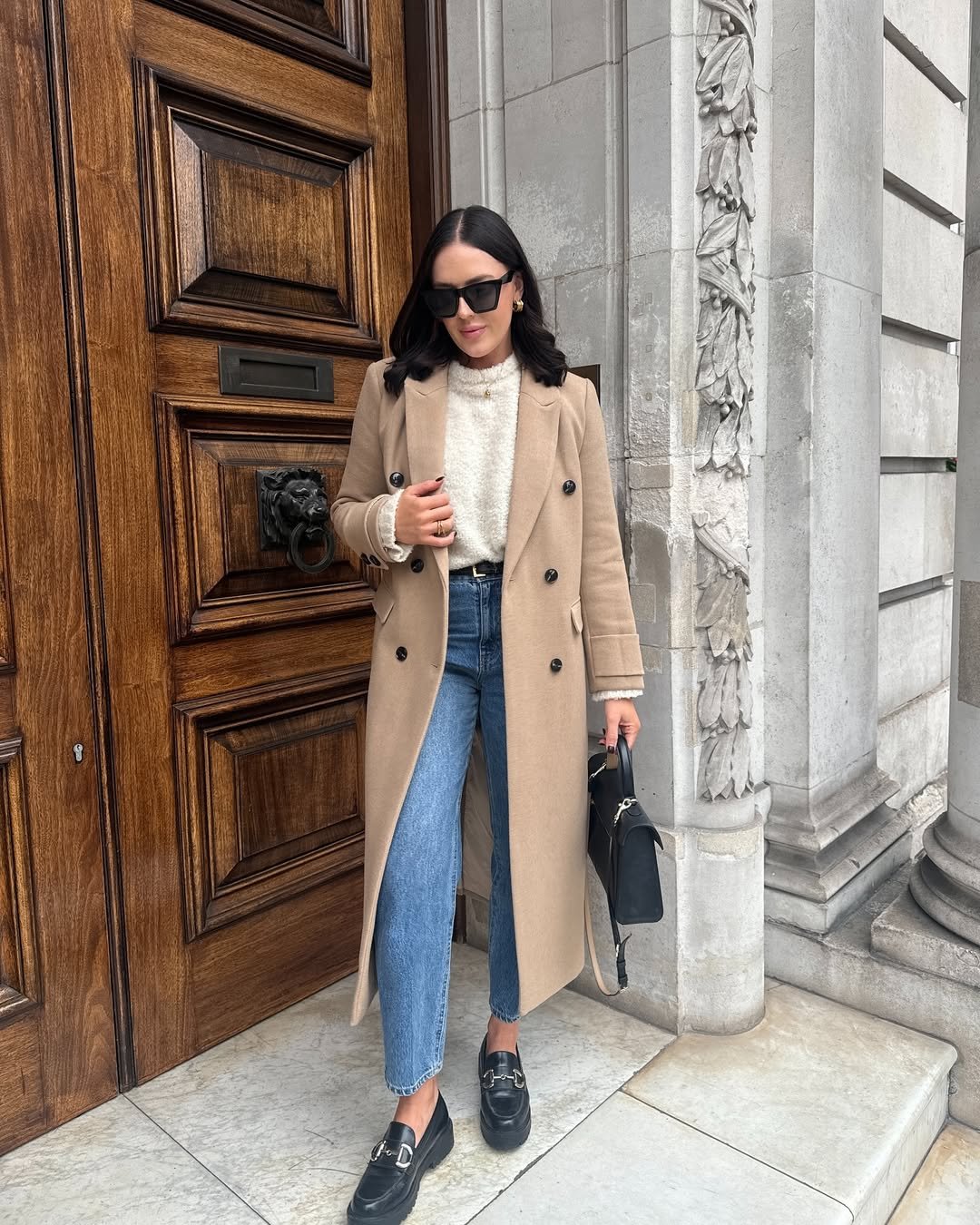 A tailored camel coat worn over straight-leg blue jeans is a combination that never disappoints. A soft knit underneath and chunky loafers add depth and texture without detracting from the clean silhouette.