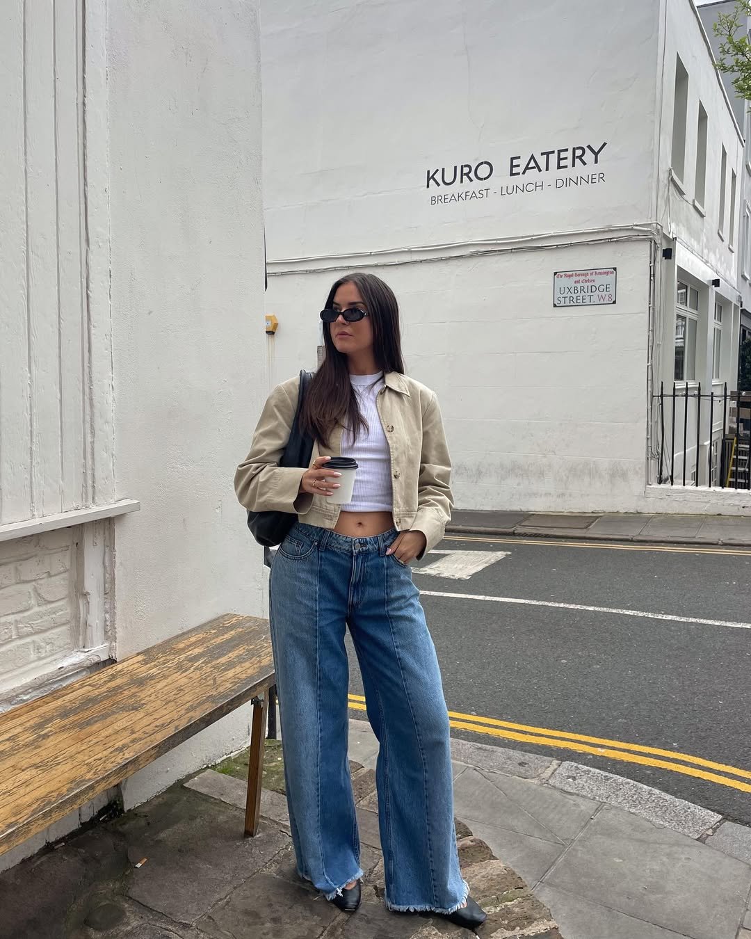 A cropped beige jacket worn over a fitted white t-shirt with wide-leg jeans creates a flattering silhouette. The slightly frayed hem adds a touch of edge to an otherwise clean palette.