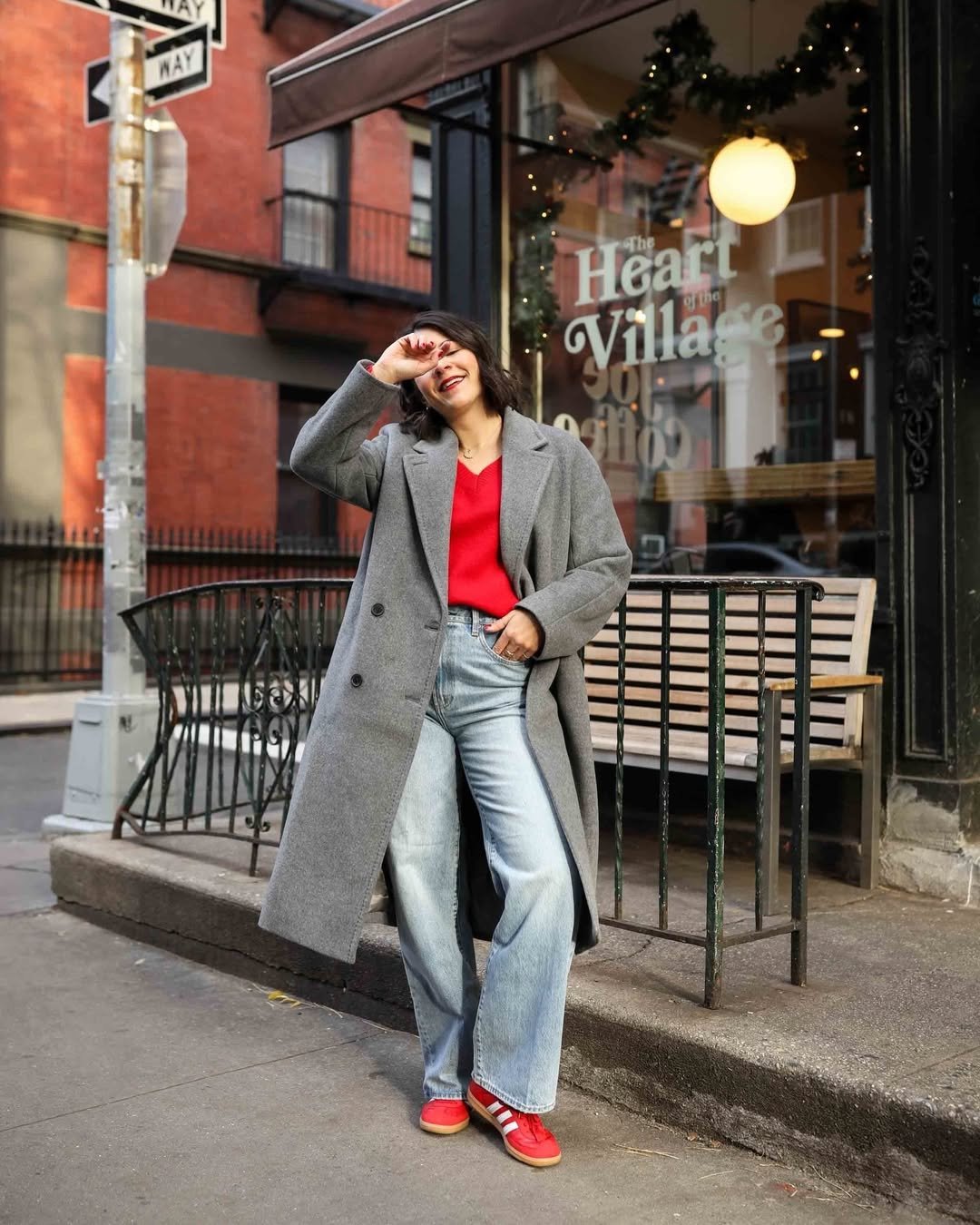 A long grey coat worn over a red knit sweater and light-wash denim forms a perfect trio for cooler weather. The bold sneakers add a touch of personality, making the outfit feel playful rather than predictable.