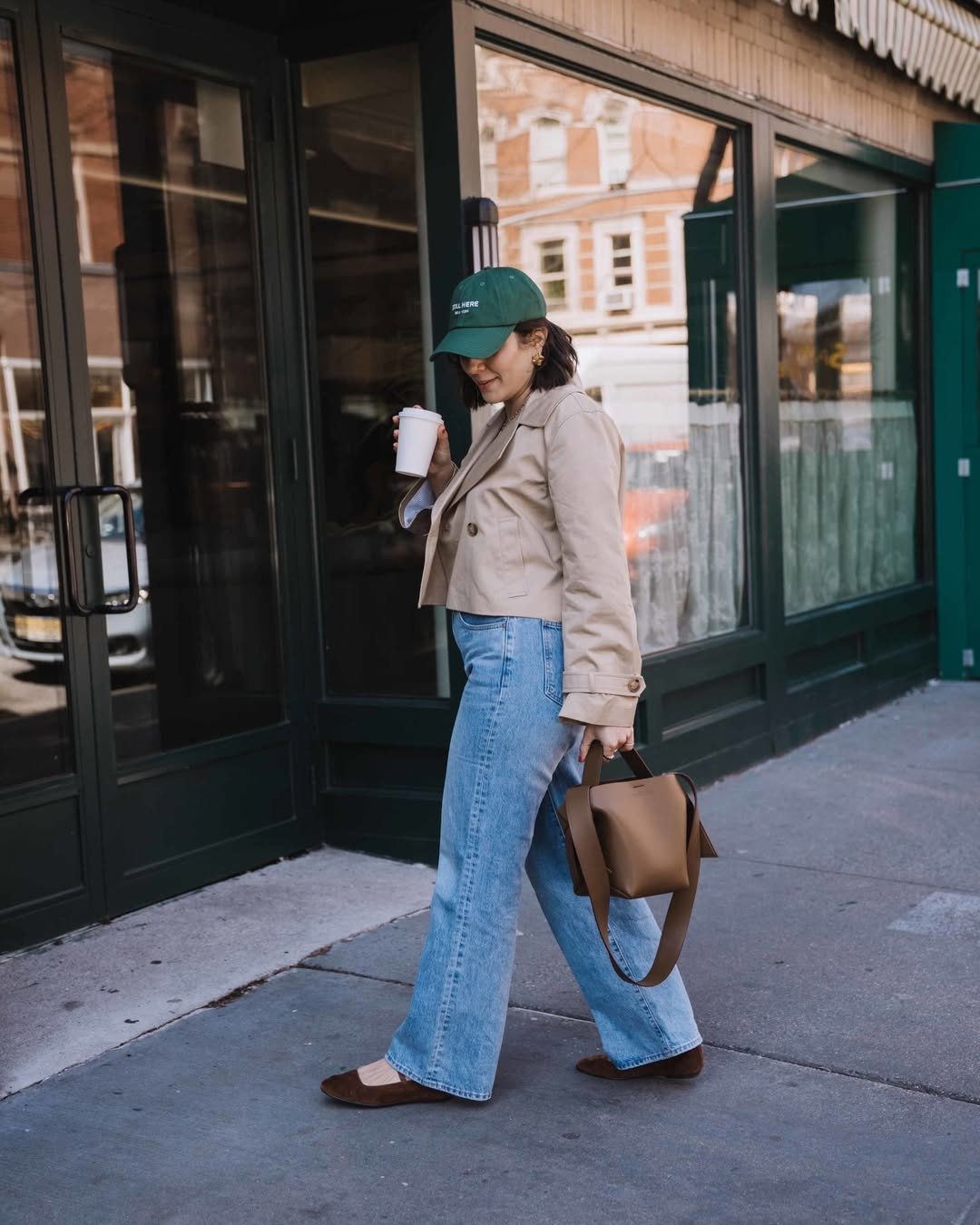 The combination of a cropped trench coat and wide-leg blue jeans exudes a distinct main character vibe for a weekday morning. Elements like the green cap, structured tan bag, and flat brown shoes contribute to an effortlessly put-together look, suggesting she grabbed coffee and inadvertently served a full fashion moment.