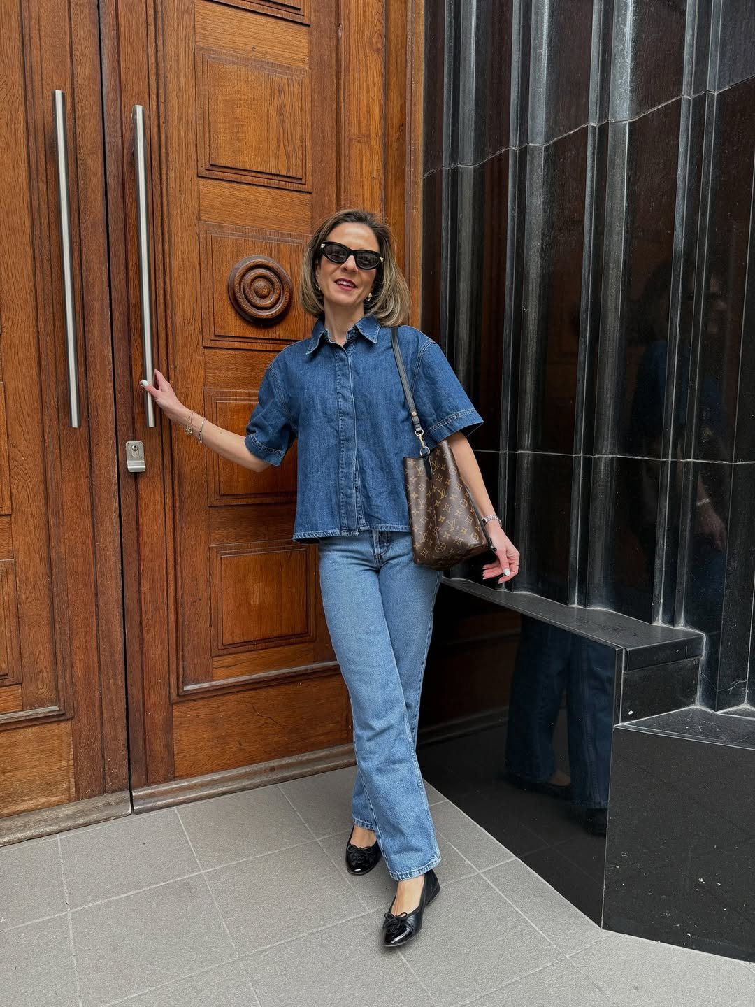 A short-sleeve denim shirt neatly tucked into straight-leg blue jeans appears fresh and contemporary, especially when the denim washes are subtly distinct. Adding ballet flats and a classic monogram bag lends a Parisian-inspired feel without appearing contrived.