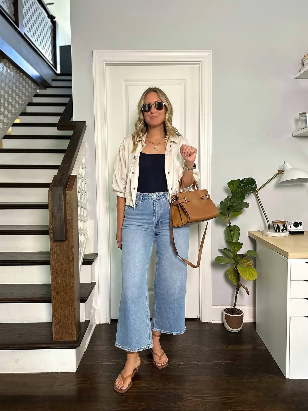 A combination of wide-leg light wash jeans, a black tank top, and a soft overshirt is a versatile ensemble suitable for various occasions, from running errands to casual dinners. A tan handbag adds a touch of refined polish.
