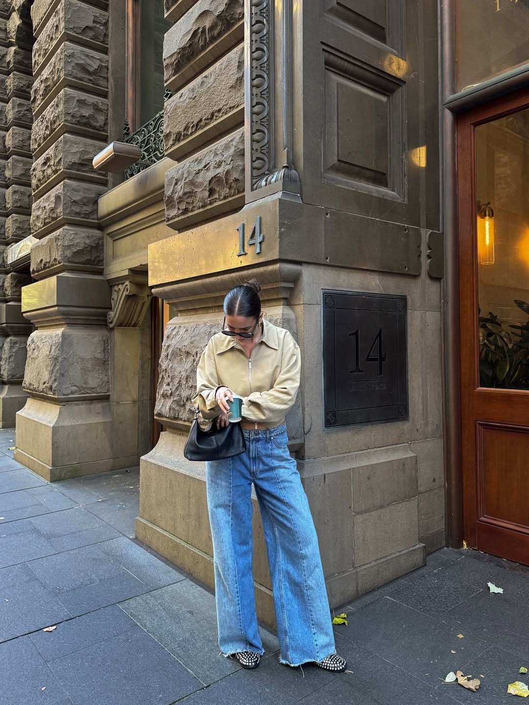 A cropped neutral jacket paired with wide-leg blue jeans achieves an ideal balance between tailored and relaxed. Pointed embellished flats introduce just enough individual style to keep the look engaging.