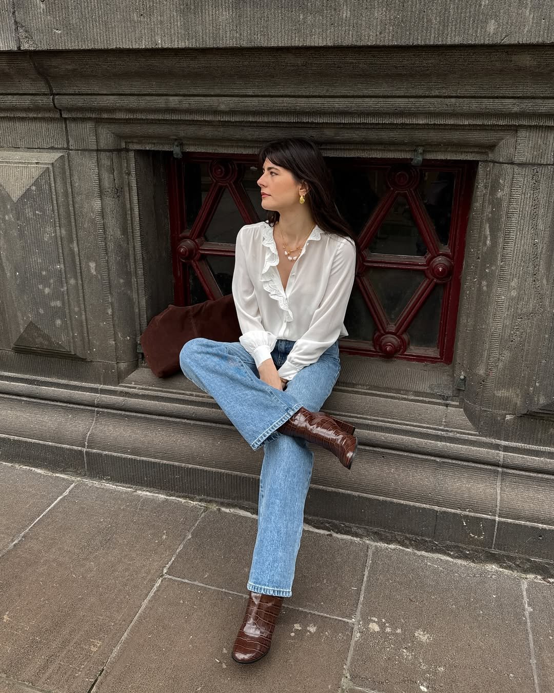 A silky white blouse with subtle ruffle details, paired with straight-leg denim and rich brown boots, creates a classic yet perpetually stylish look. The contrast in textures alone adds significant appeal.