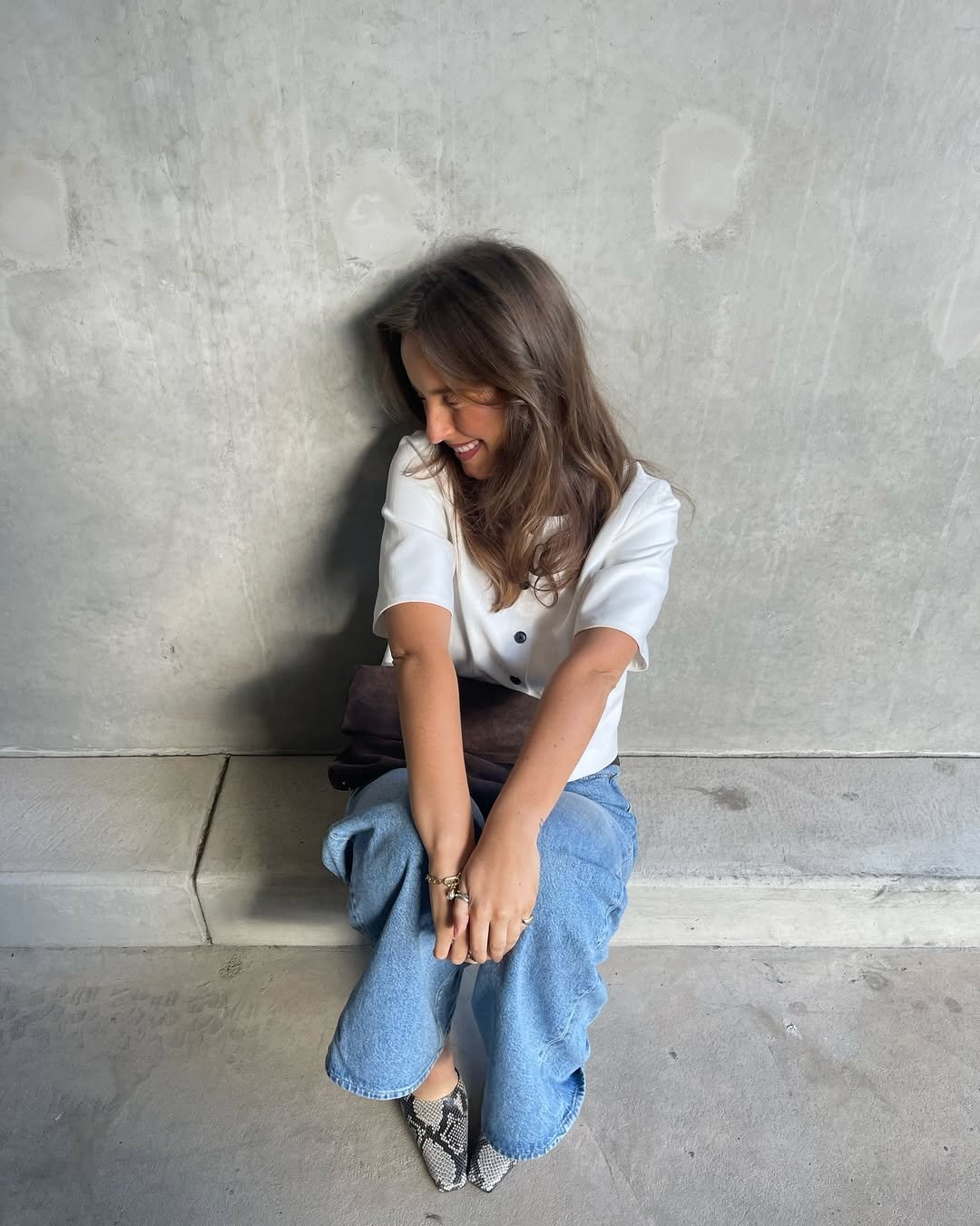 A simple white blouse paired with classic blue jeans might sound conventional, but this ensemble proves its enduring appeal. The relaxed fit of the denim, delicate jewelry, and snakeskin flats strike a perfect balance between femininity and grounded style.