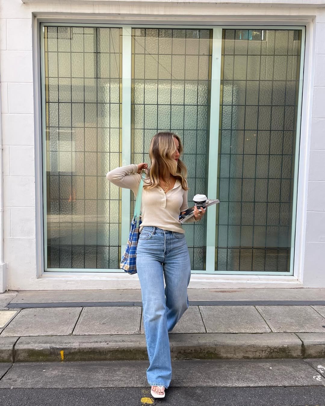 A ribbed cream henley tucked into pale blue wide-leg jeans creates a soft and intentional look. A plaid tote and a takeaway coffee cup add everyday charm, contributing to the overall lived-in feel of the outfit.