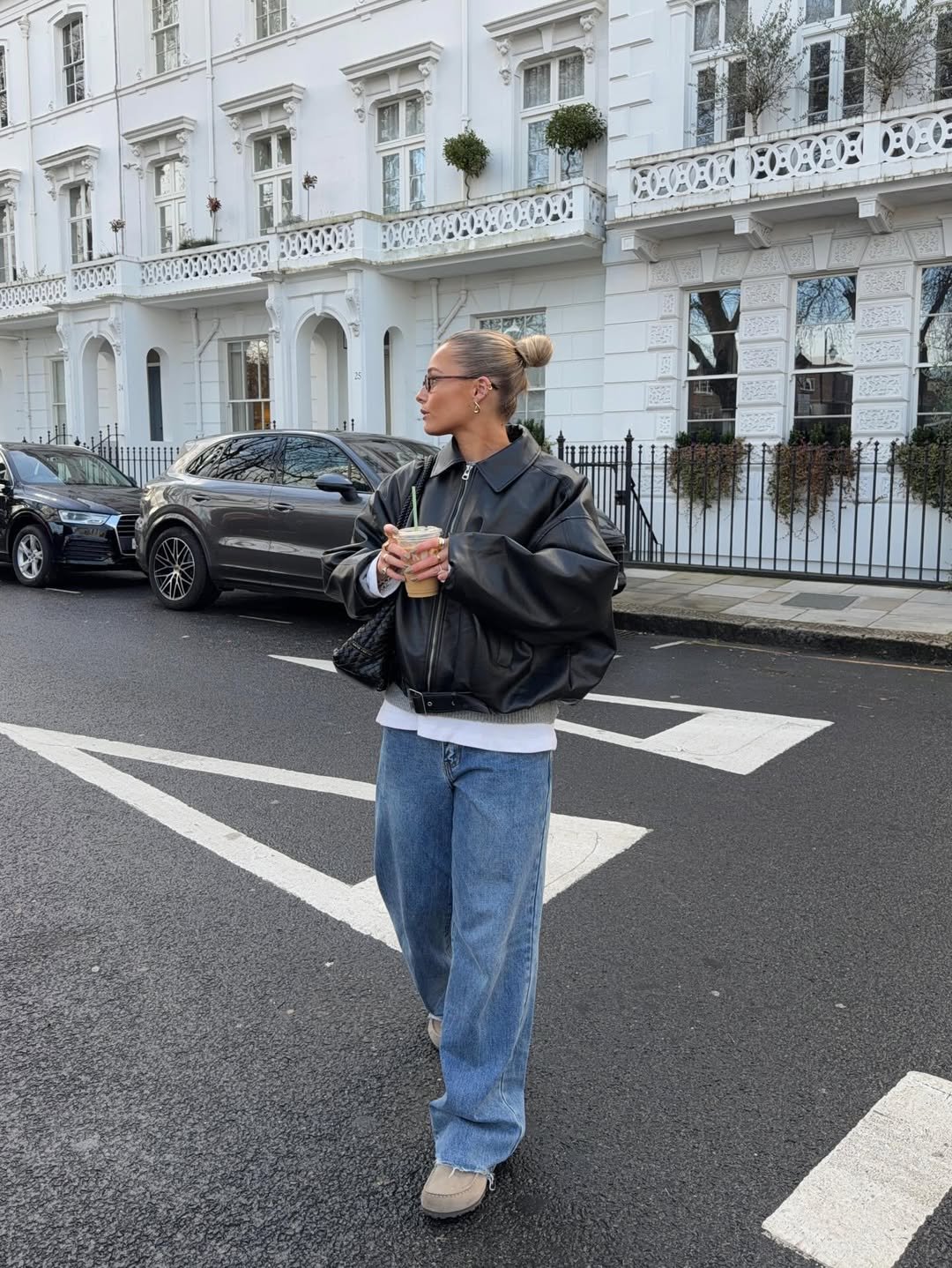 An oversized leather jacket worn over relaxed jeans is an enduringly cool combination. A clean bun and neutral layers underneath ensure the silhouette remains intentional rather than bulky.