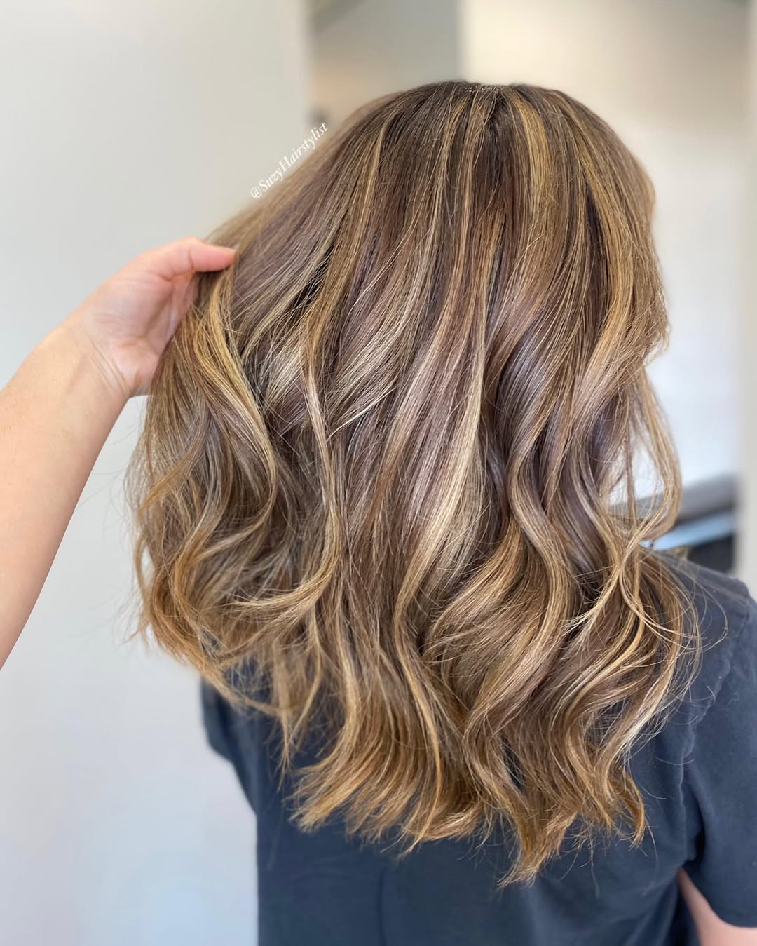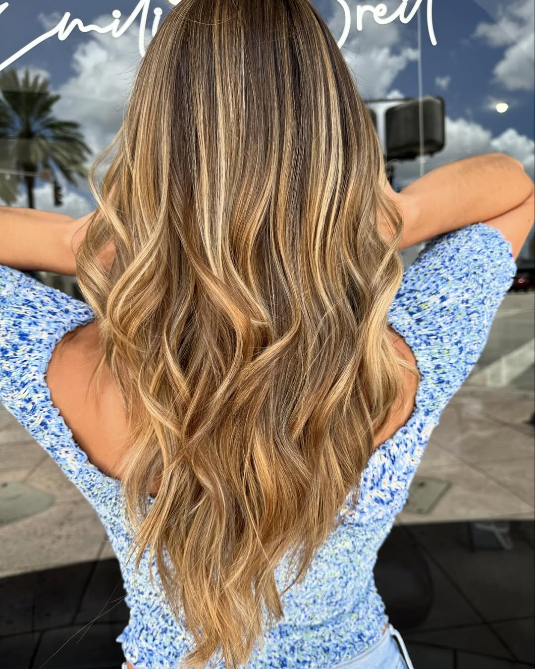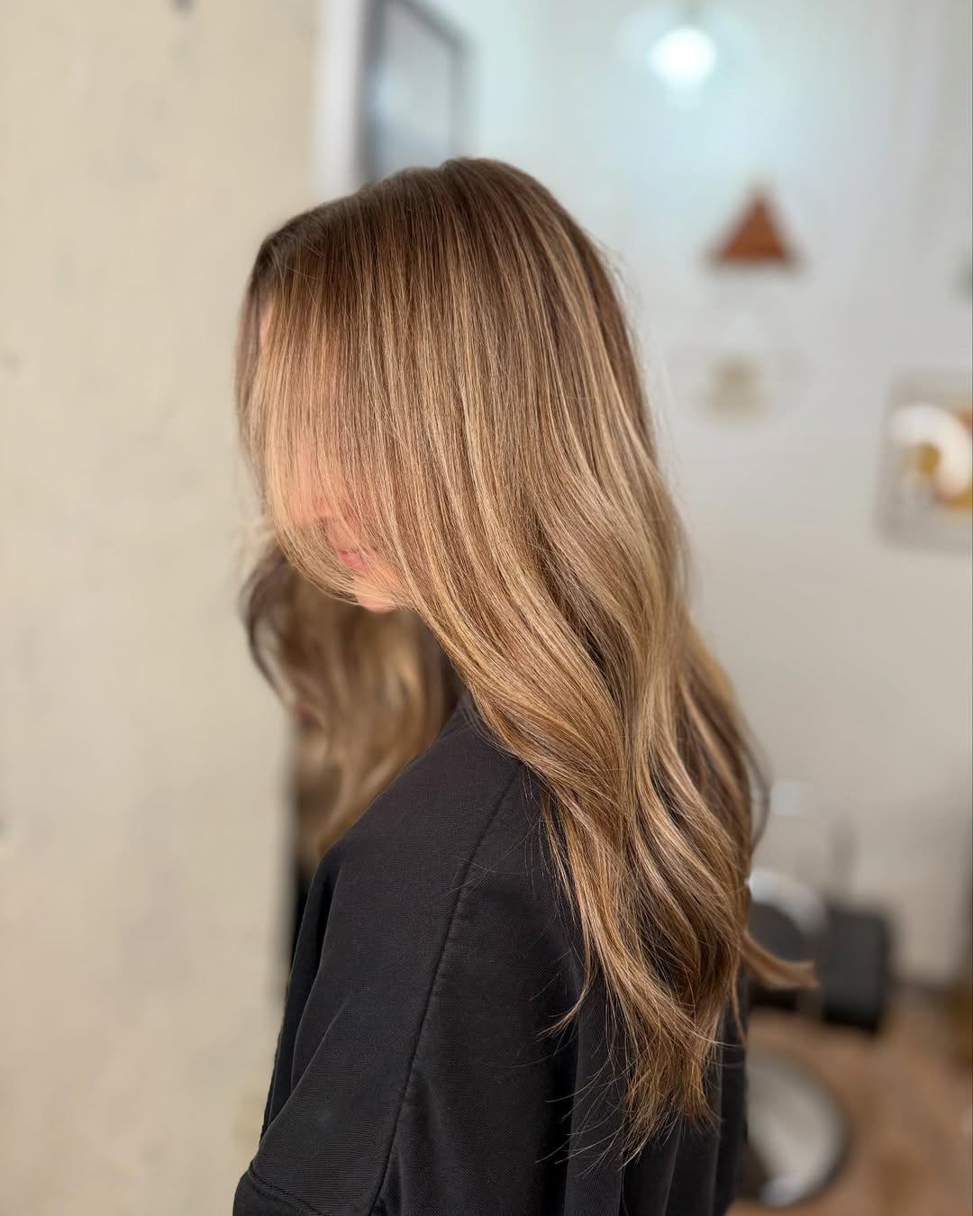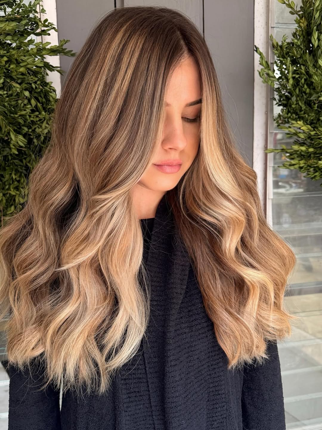 This hairstyle embodies a sun-drenched aesthetic, with caramel blonde tones seamlessly blended throughout to achieve a radiant, beachy glow. It’s a relaxed, multidimensional color that looks effortlessly chic.