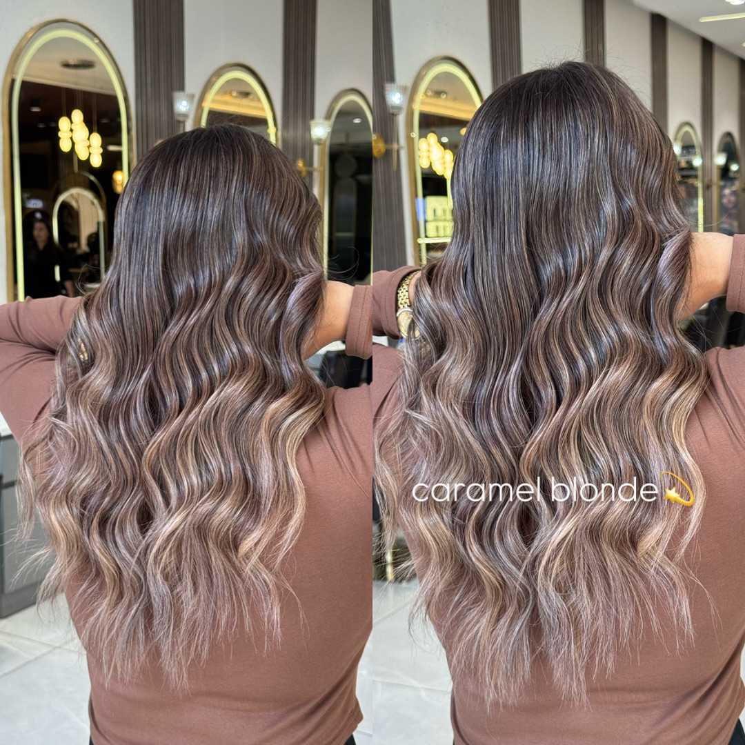 This interpretation of caramel blonde focuses on depth, with subtle contrast woven throughout the lengths. The result is a modern and wearable dimension, avoiding a brassy or overly bold appearance.