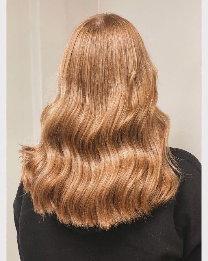 This version of caramel blonde is beautifully balanced, incorporating cooler undertones that temper the warmth for a more subtle, contemporary feel. The waves add texture without detracting from the color itself.