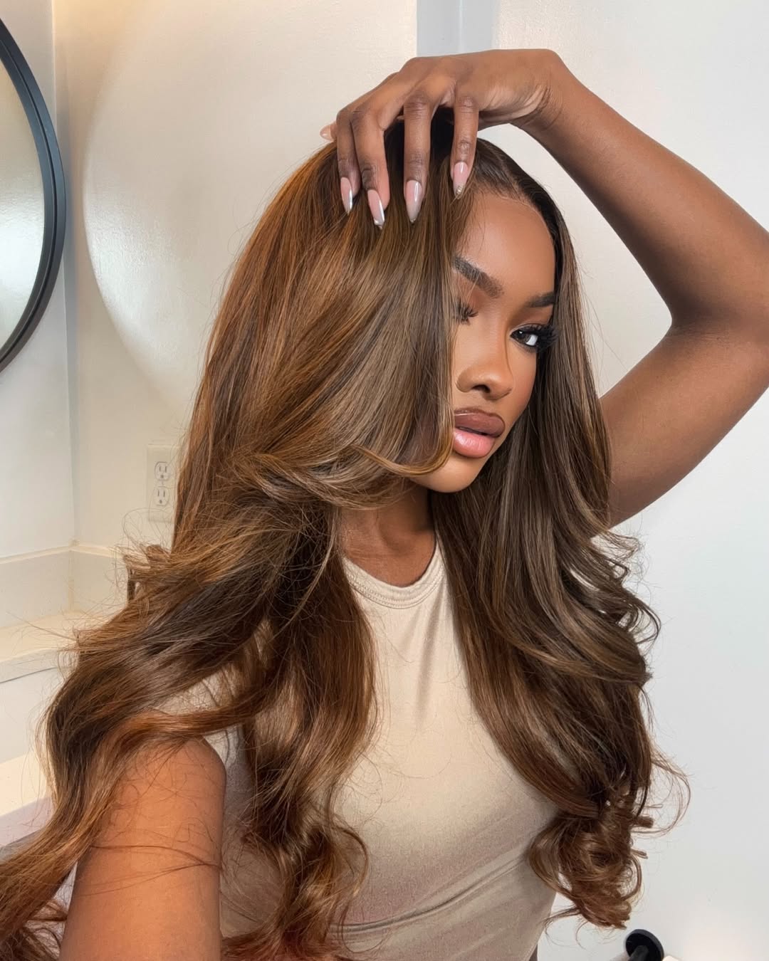 In this style, the caramel tones lean warmer, with honey-infused highlights weaving through a slightly darker base. The subtle yet rich blend creates movement that beautifully catches the light.