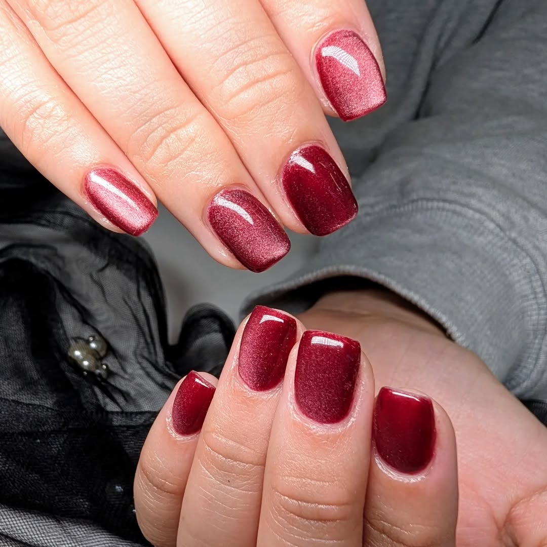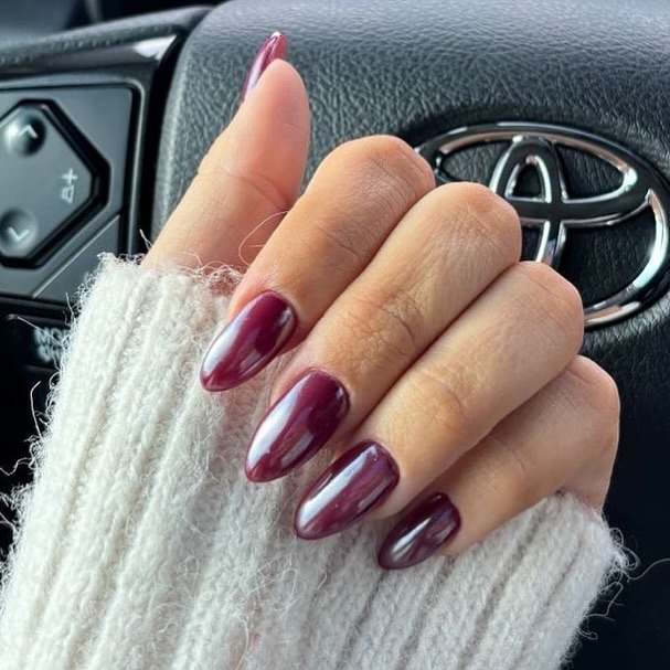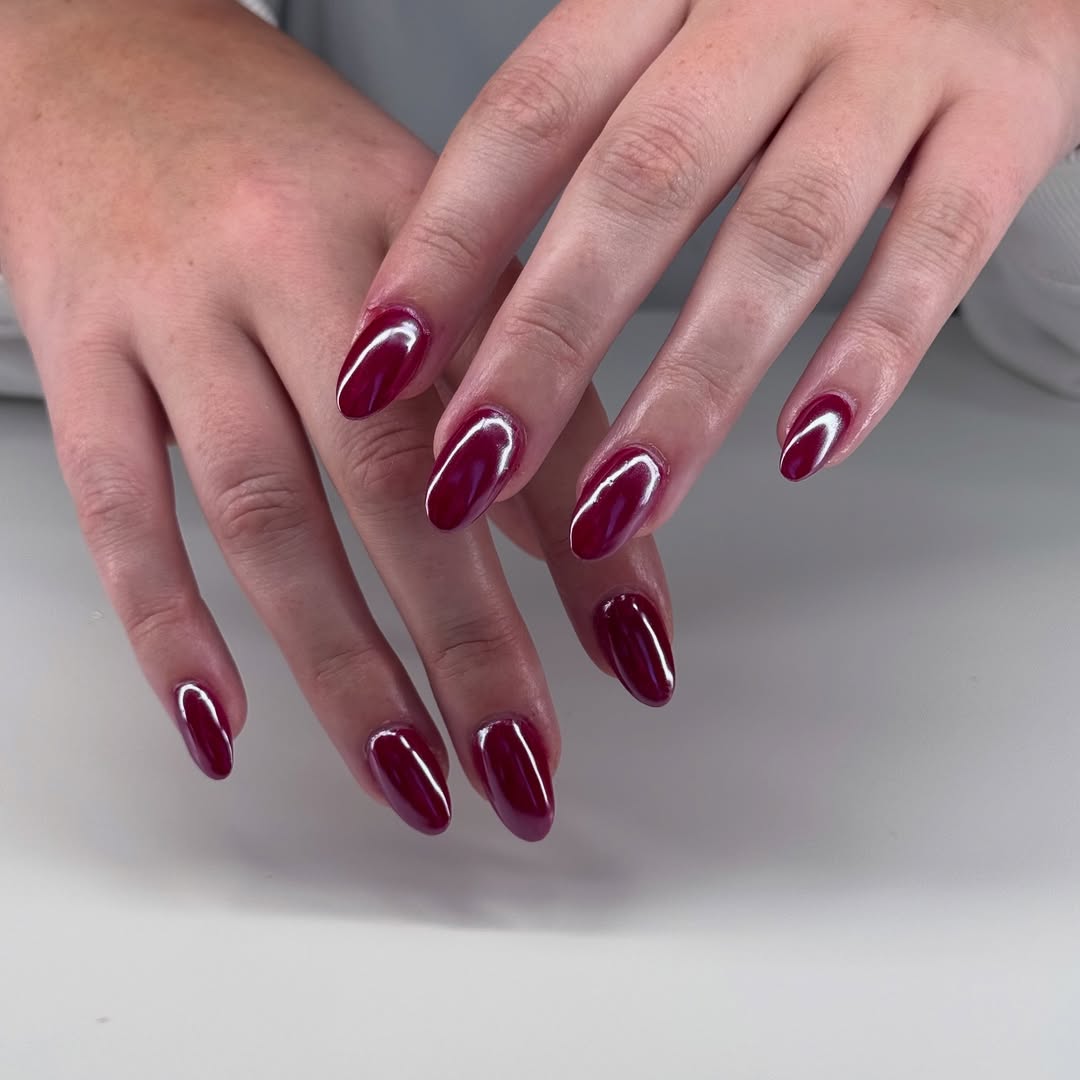 This striking manicure features a high-shine, metallic cranberry finish that appears molten and liquid. It’s a bold and fun choice, perfect for nights out and moments when you want to make a strong, unapologetic statement.