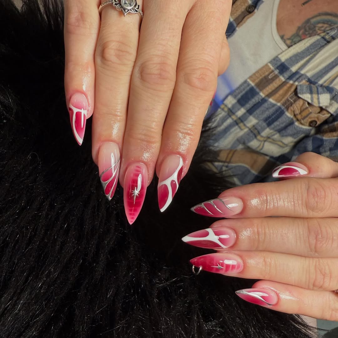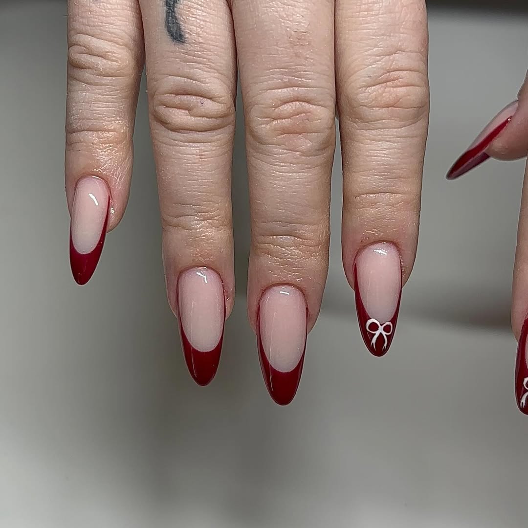 Inject personality into your cranberry manicure with sharp tips, negative space, and sculpted bow details. This design offers a high-fashion edge that remains sophisticated and playful, perfect for those who want their nails to be a conversation starter.