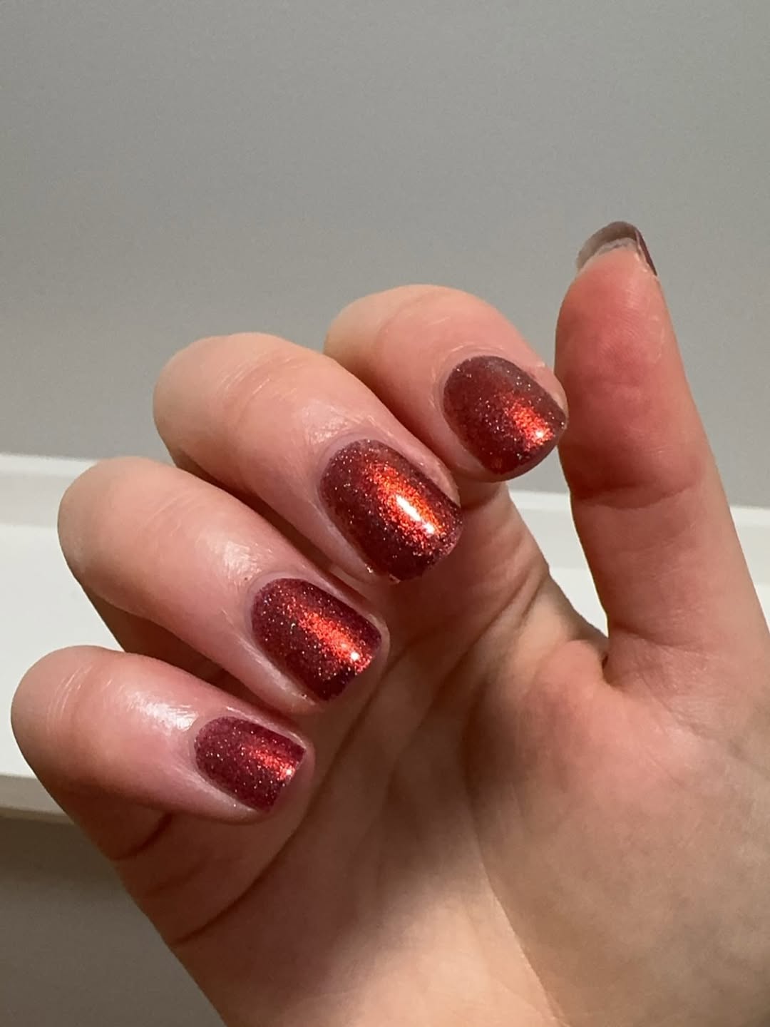 This short, shimmery cranberry nail design incorporates a coppery glow, ideal for cooler weather. The fine sparkle provides a flattering, soft effect, embodying cozy nail energy that is both approachable and chic.