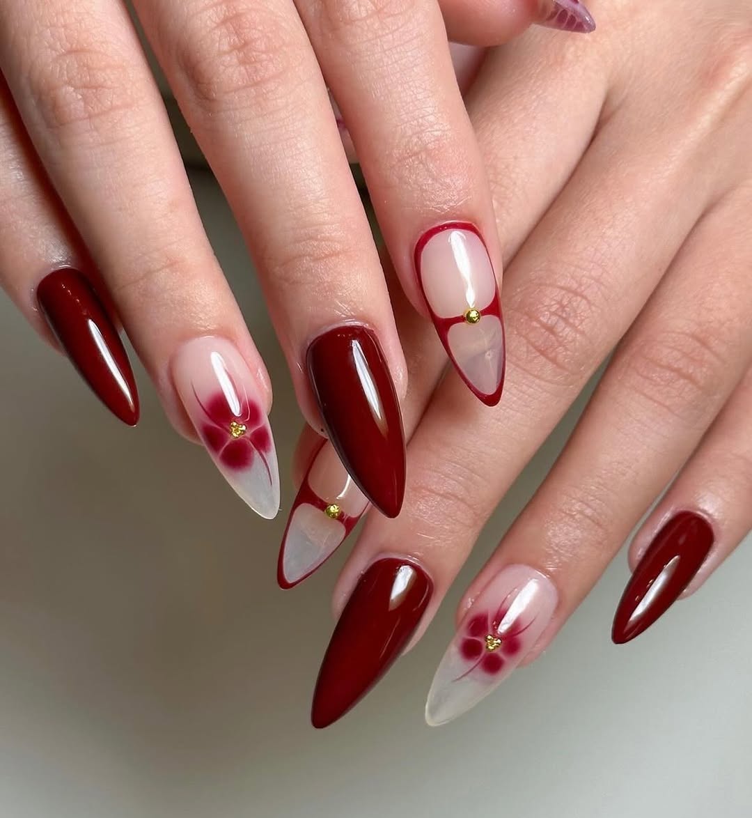 This approach cleverly mixes solid cranberry nails with playful accent designs. It maintains color harmony while allowing certain nails to become focal points. The result is expressive and engaging without feeling cluttered, suitable for those who desire a polished yet unique manicure.