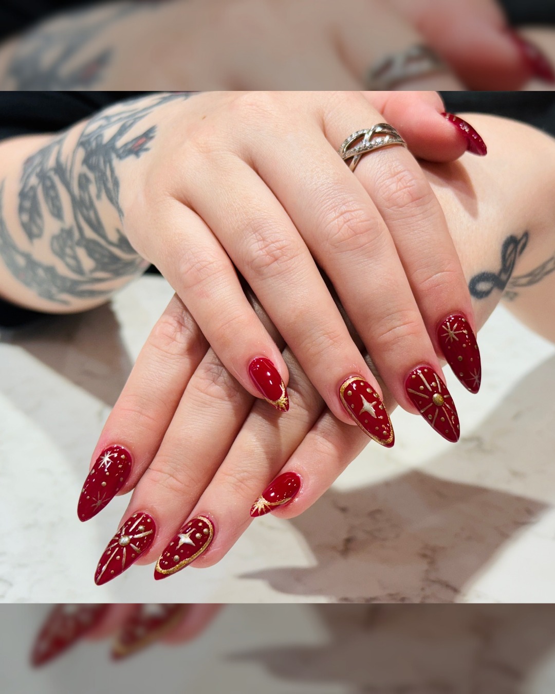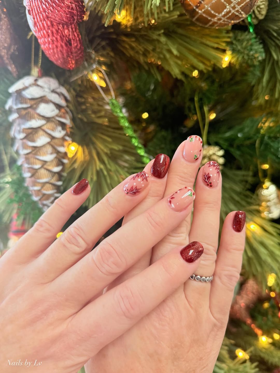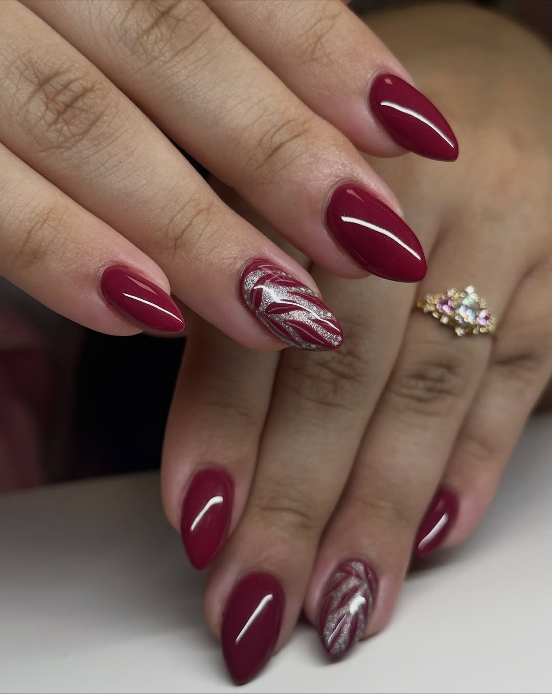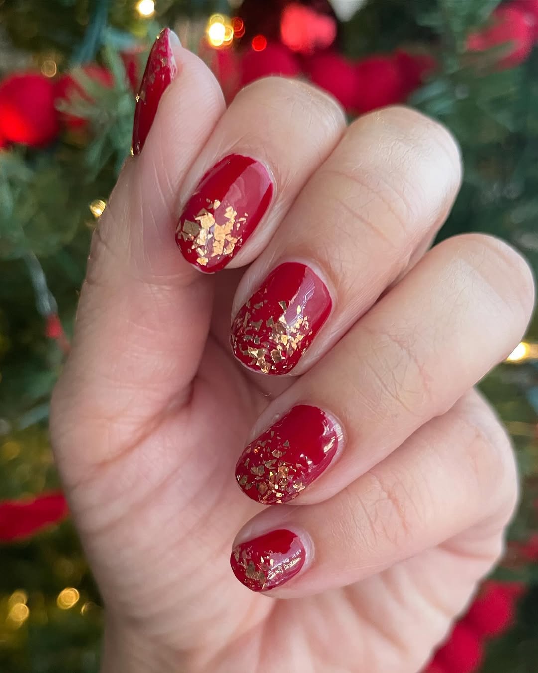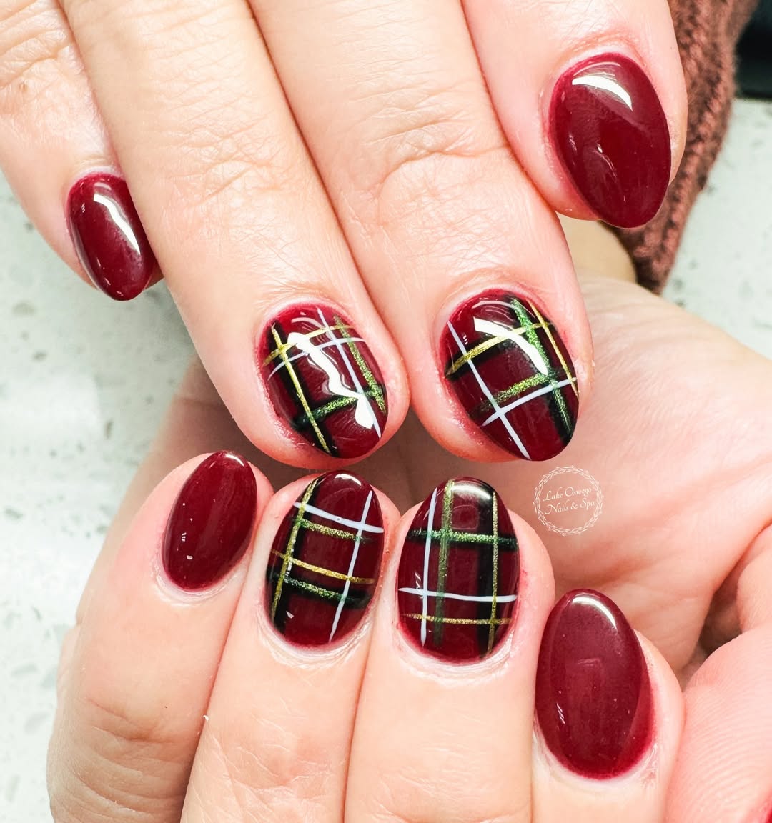 The striking contrast of gold foil against a deep cranberry base adds texture and dimension, creating an instantly luxurious feel. This design feels festive and indulgent, like wearable jewelry for your fingertips.