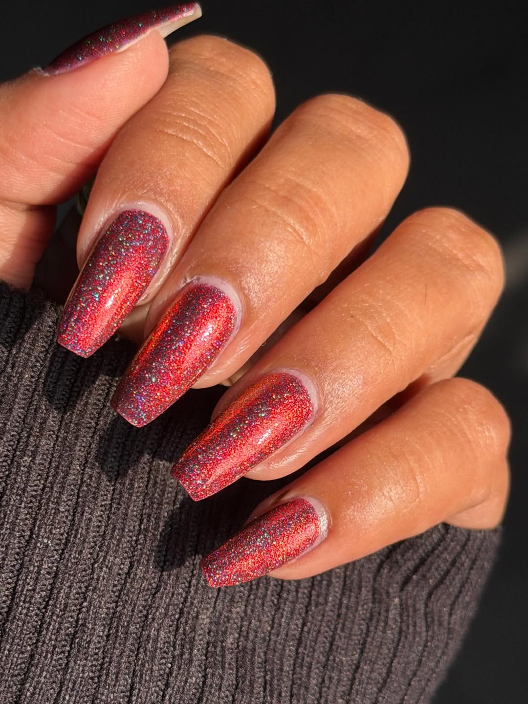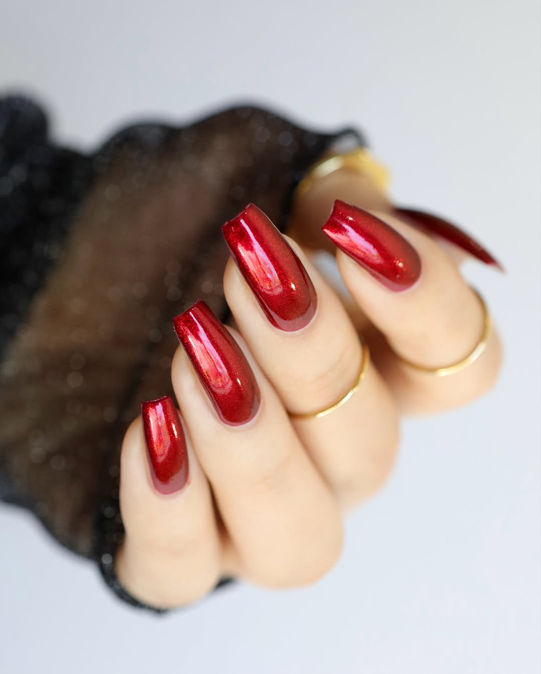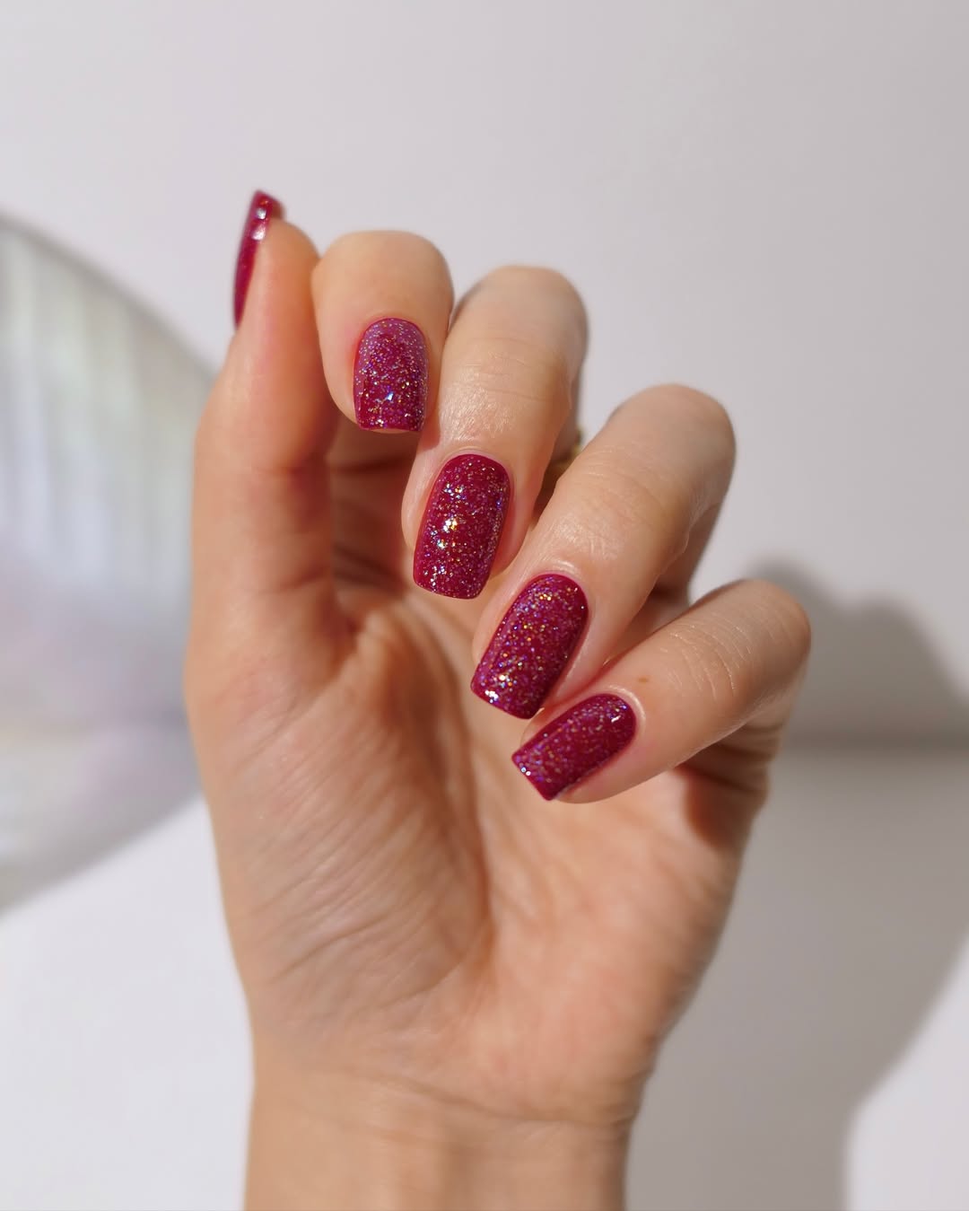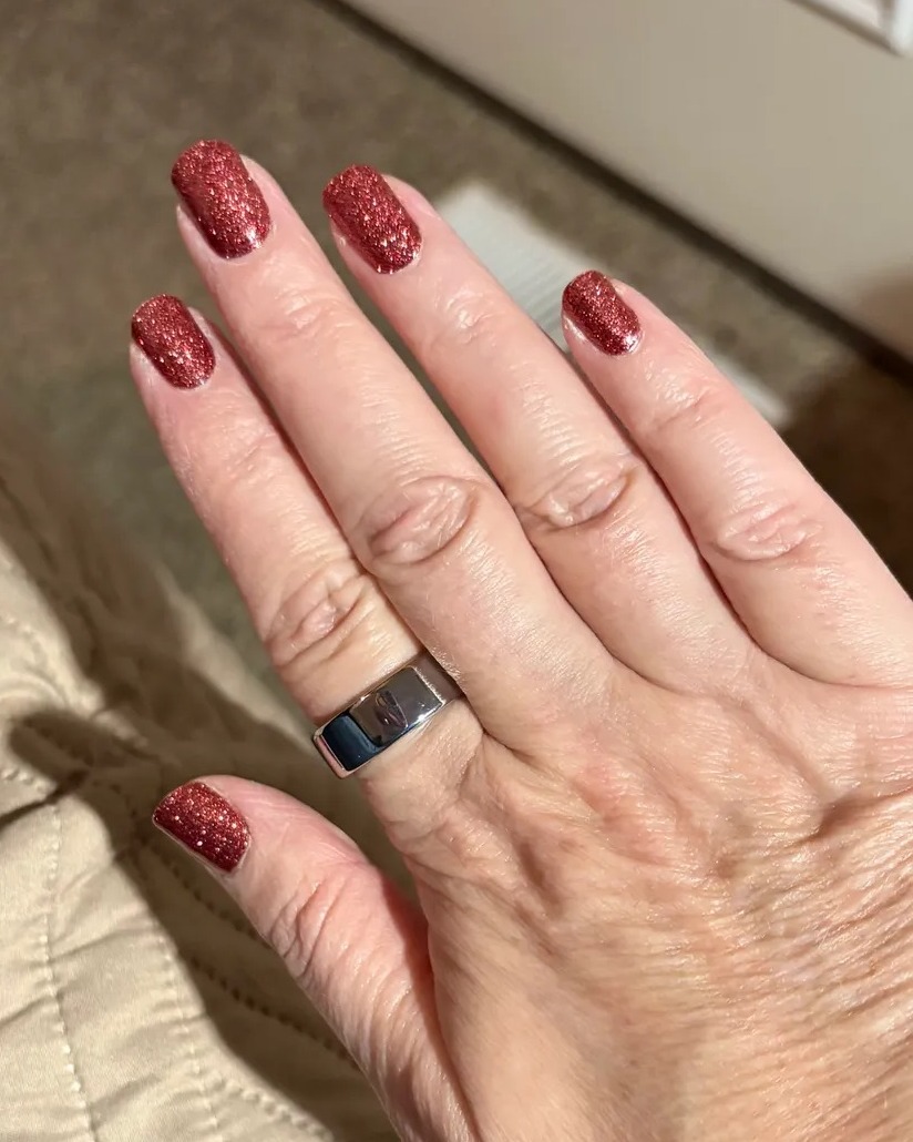 Fine shimmer layered over a cranberry base creates a captivating, molten effect that subtly shifts with movement. This design adds just the right amount of playful sparkle to keep things interesting without being overpowering.